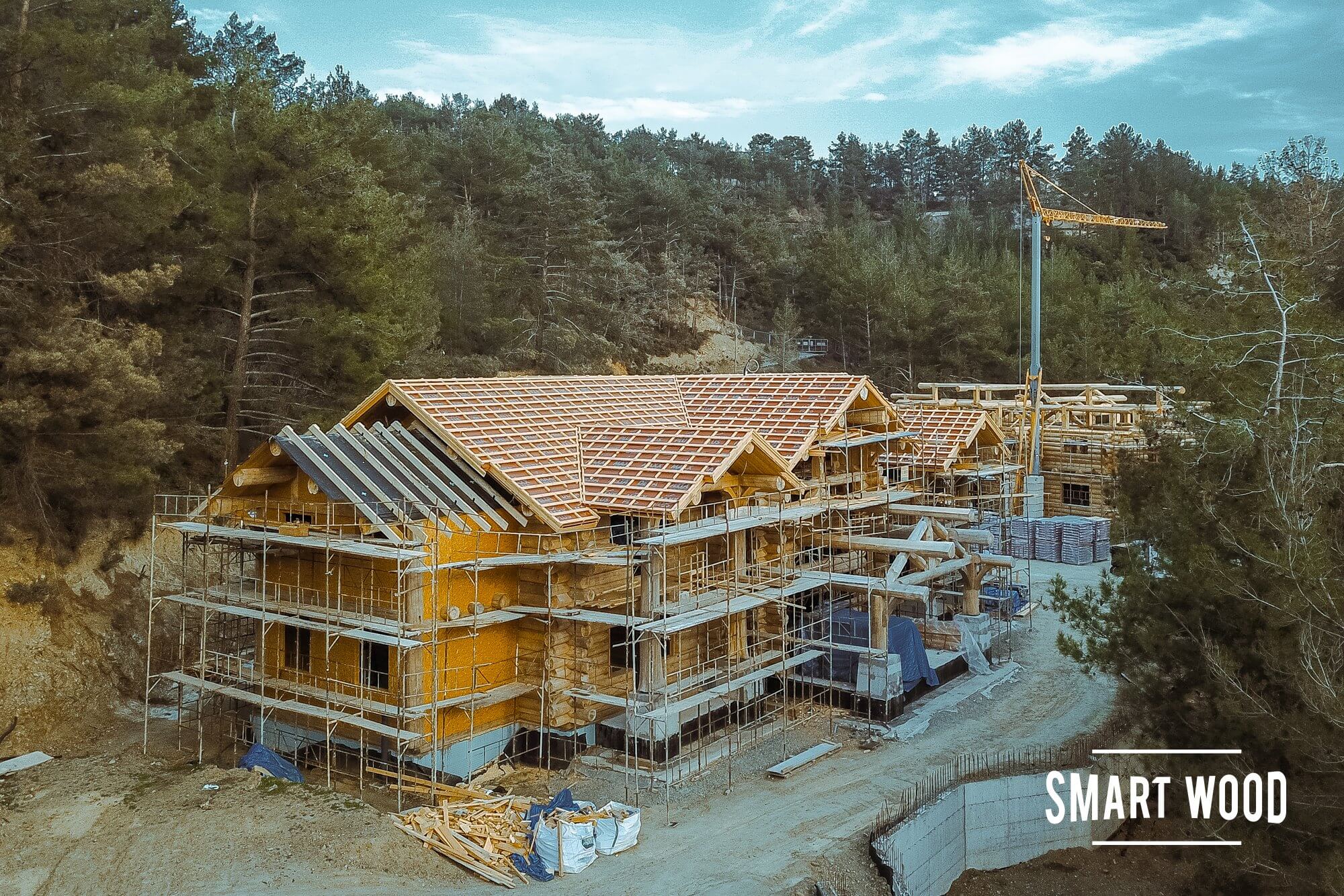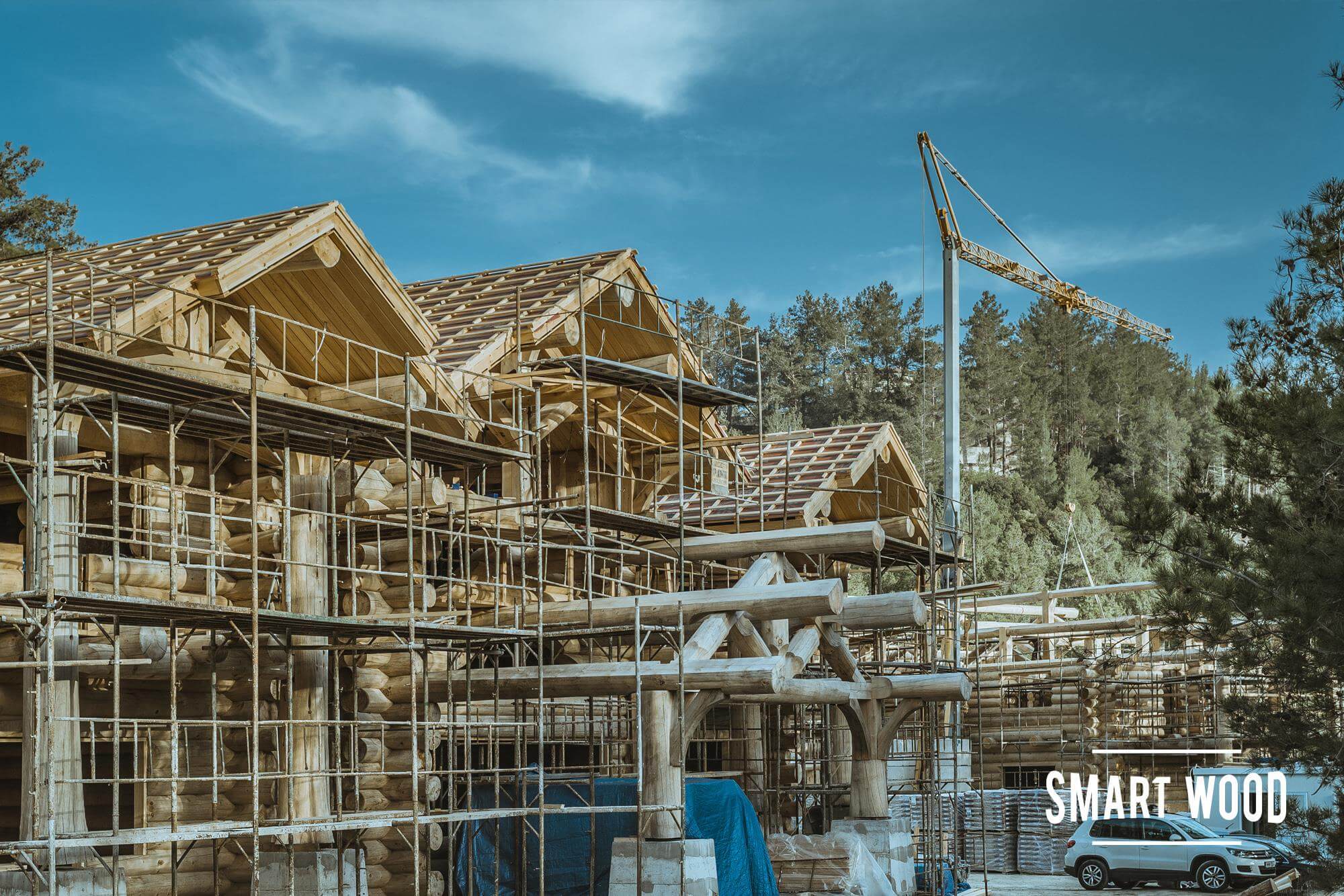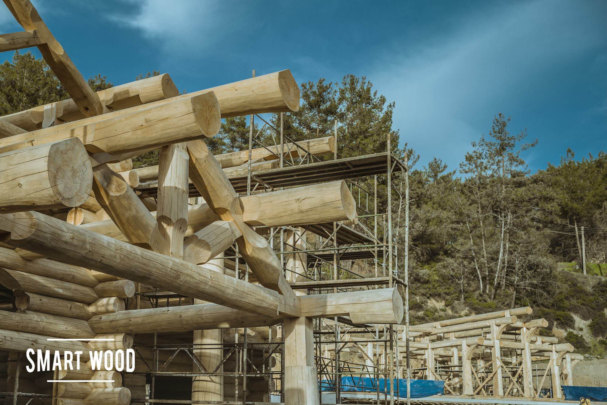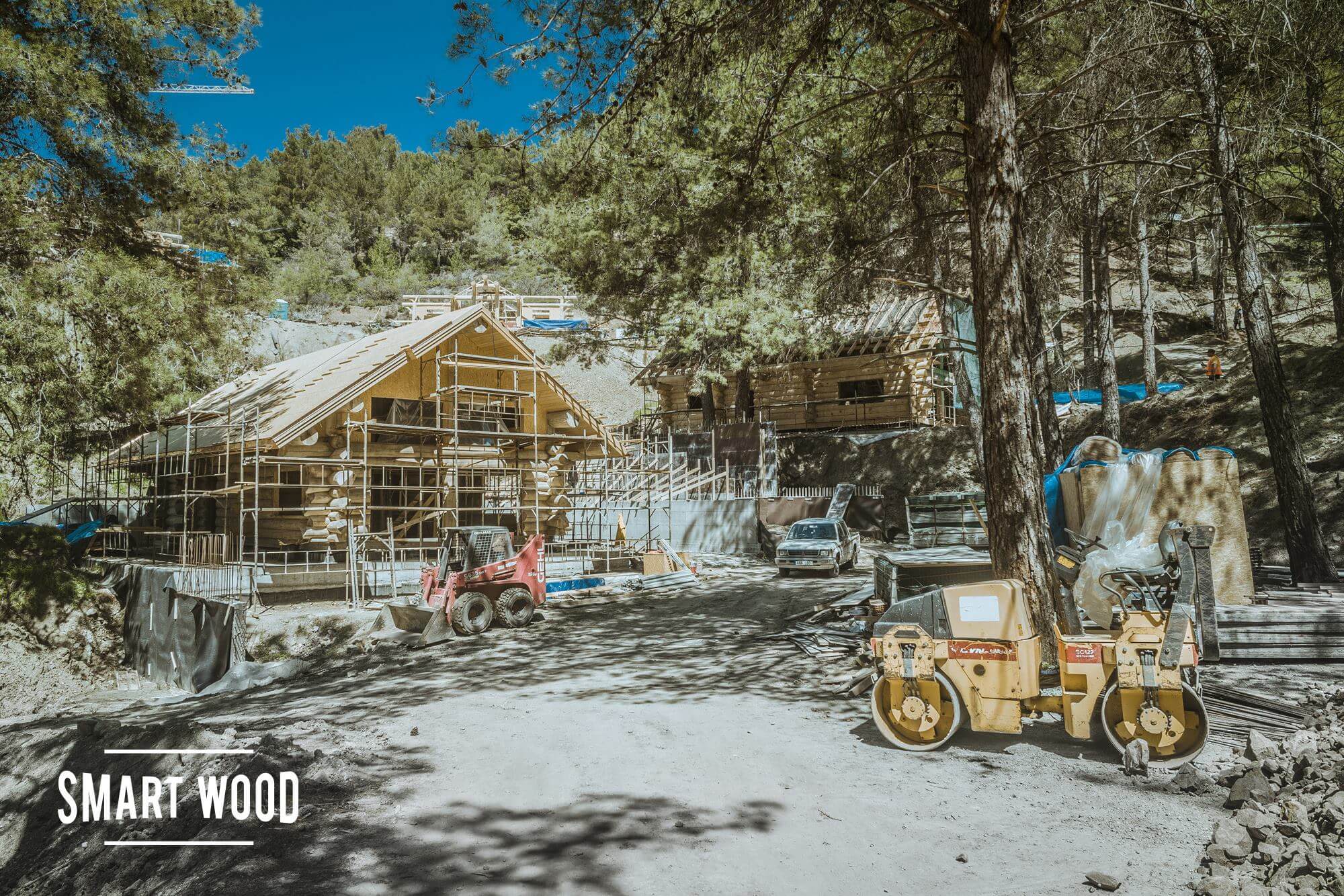 Закончили монтаж обоих домов, готовы два сруба бани и бревенчатый каркас гаража.