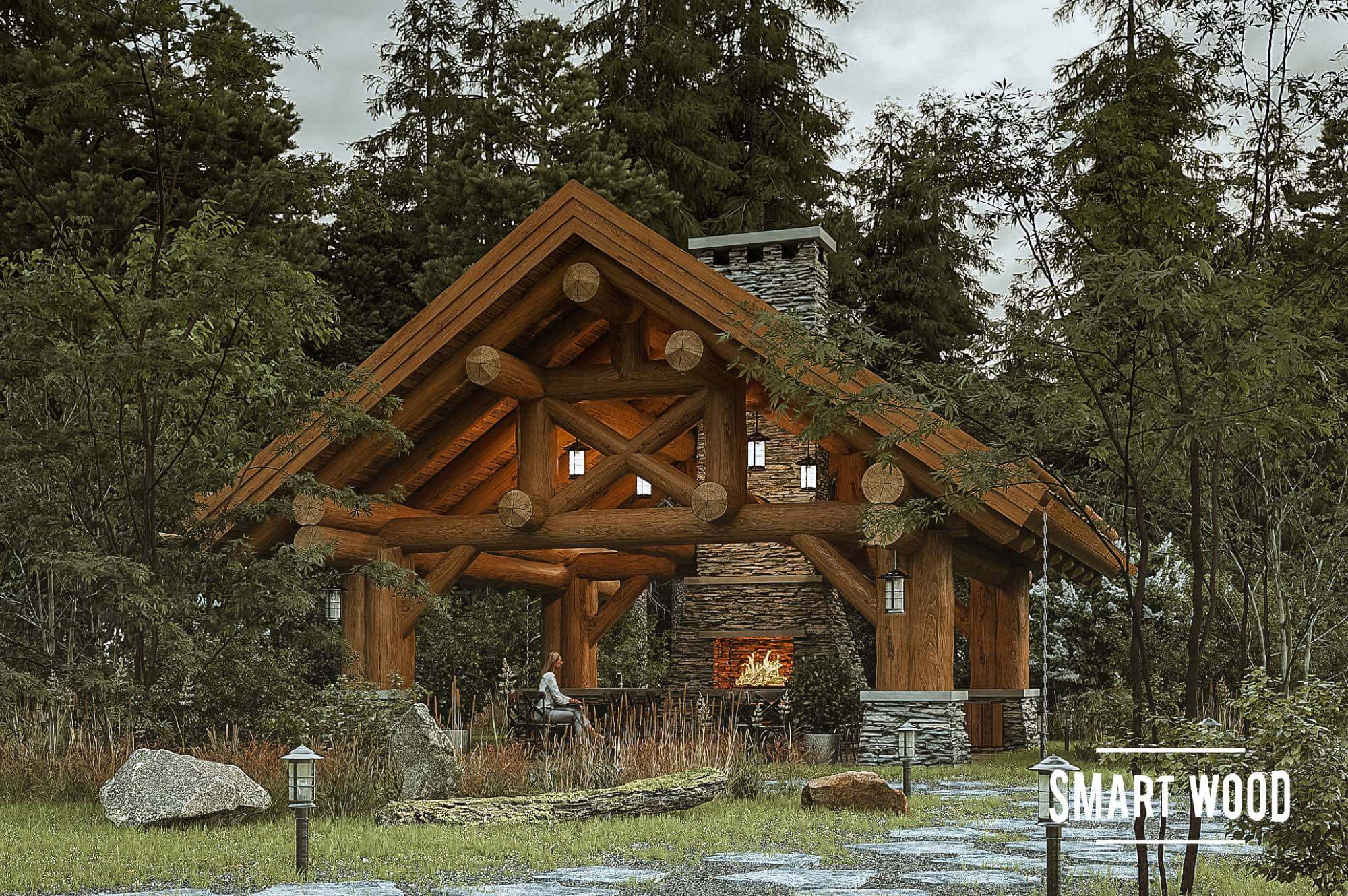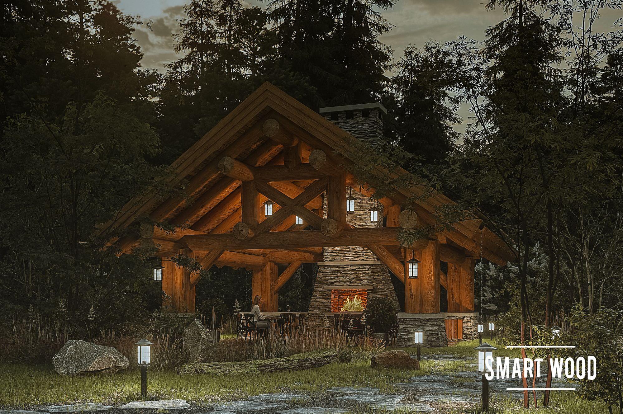 По сути своей «Тойма» — это кухня-столовая на свежем воздухе, место, где можно приготовить барбекю и провести время с друзьями и семьей. По нашей задумке беседка будет выполнена из сибирского кедра, достаточно крупного — от 500 мм. в диаметре. Остов беседки — каркас Post&Beam, финишное крышное покрытие кровли — лиственничная дранка. Все это довольно классические и очень лаконичные решения — мы хотели, чтобы такая постройка легко вписалась в любой участок и гармонично смотрелась с любым, уже построенным на нем домом. Характер же ей придают две яркие детали. Первая — крестовая ферма под крышей, которая одновременно несет на себе нагрузку и в то же время делает фасад беседки объемным и запоминающимся.