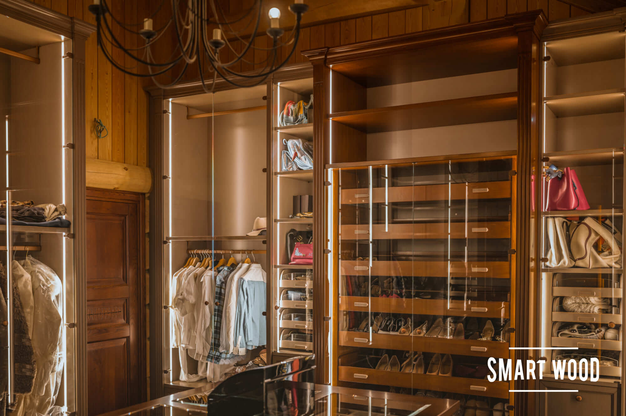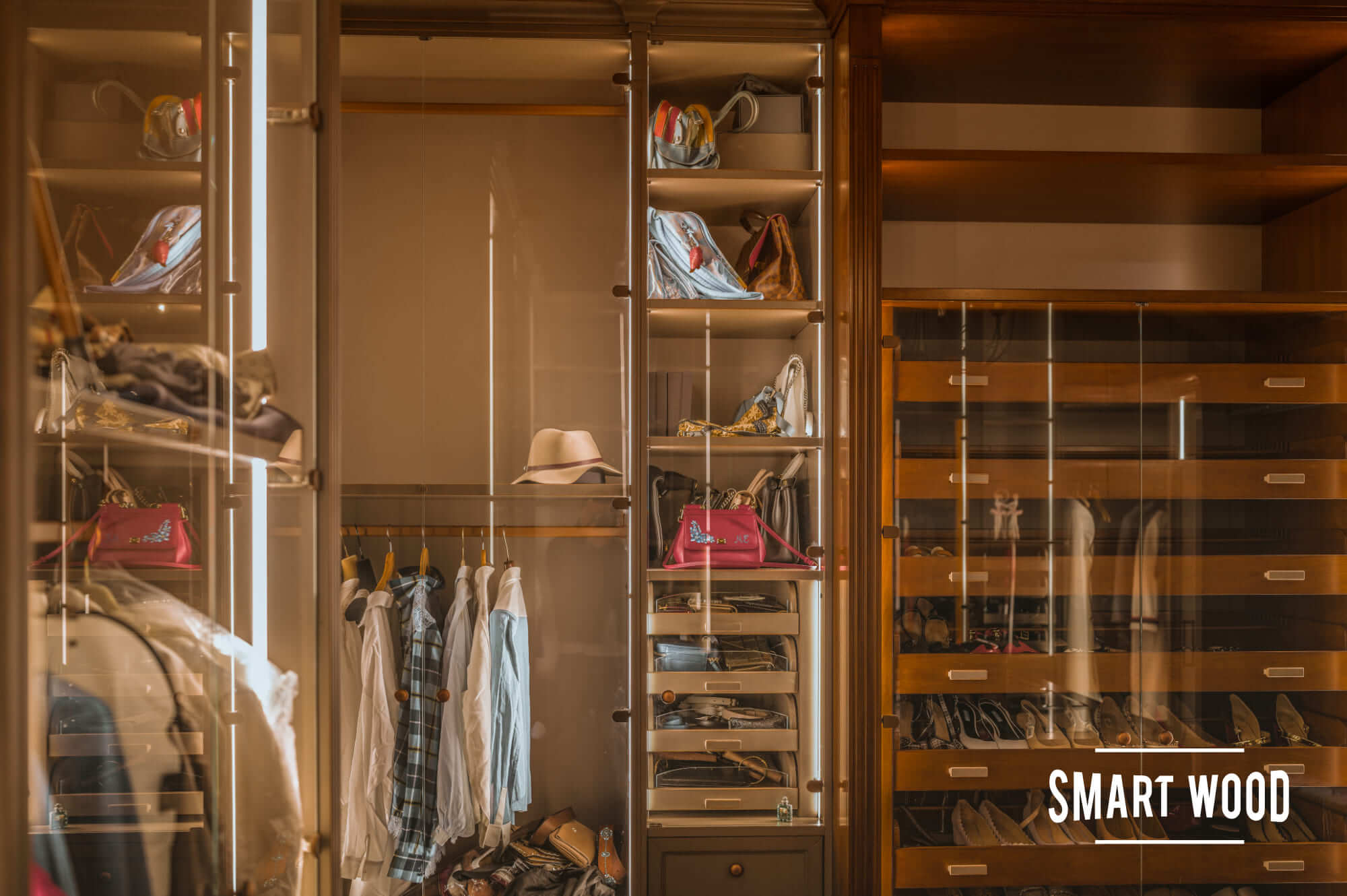 Заказчики просили, чтобы все вещи и аксессуары были на виду, поэтому все полки в гардеробной открытые, часть из них ограждена стеклом.