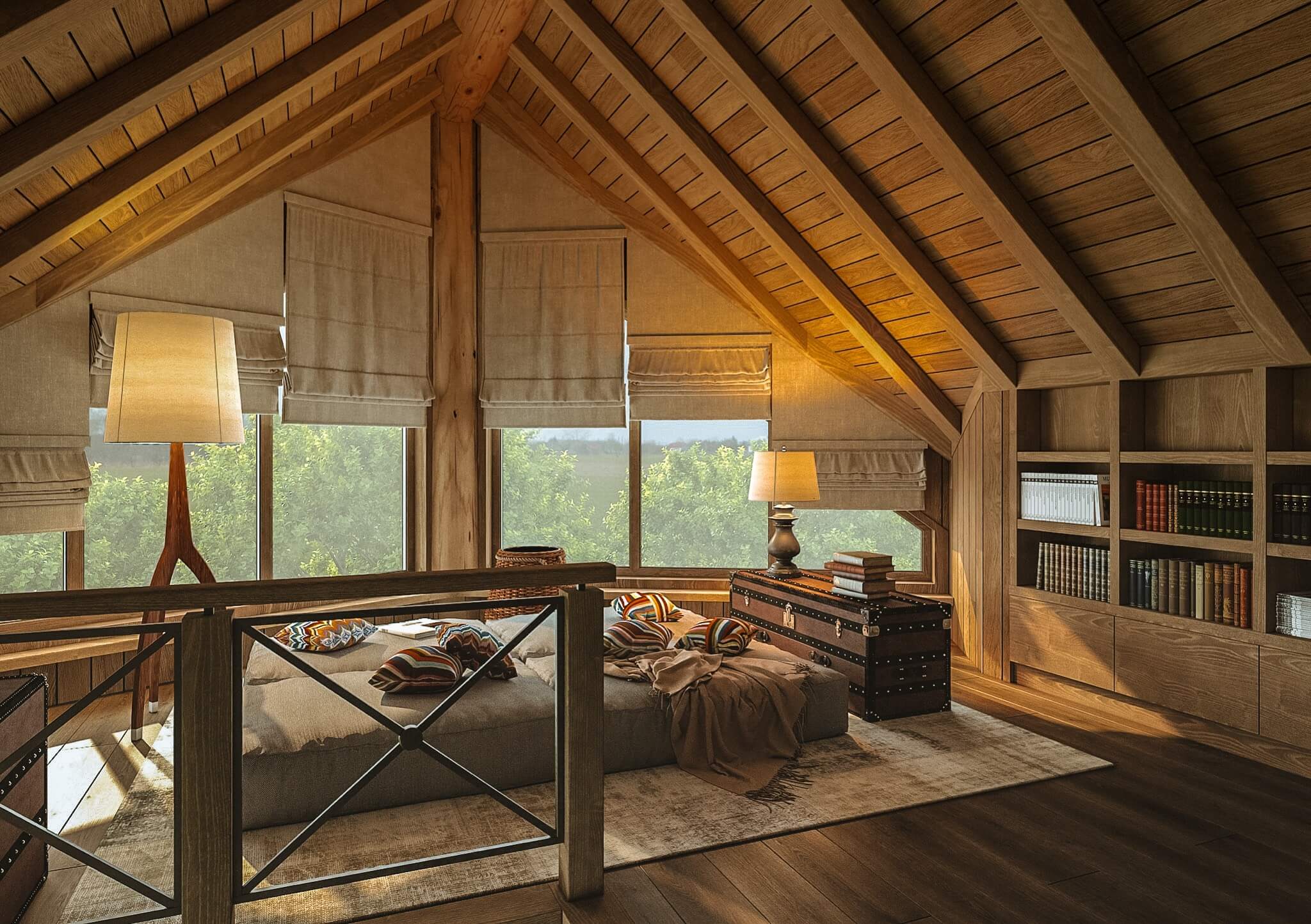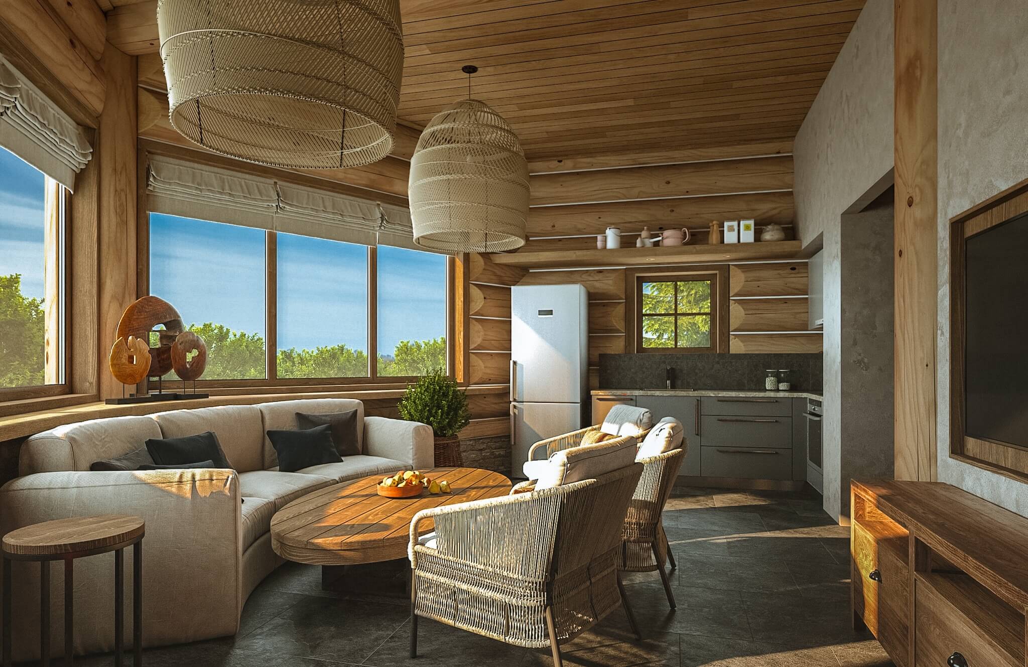 Первый этаж — это банный комплекс: душевая и собственно баня и большая уютная гостиная, где можно собраться после бани за овальным столом или отдохнуть на мягком диване перед камином. Второй этаж — две одинаковые спальни с удобными кроватями и вместительными встроенными шкафами и ещё одна просторная комната с огромными окнами. Здесь можно уединиться для беседы, почитать или просто отдохнуть в тишине.
