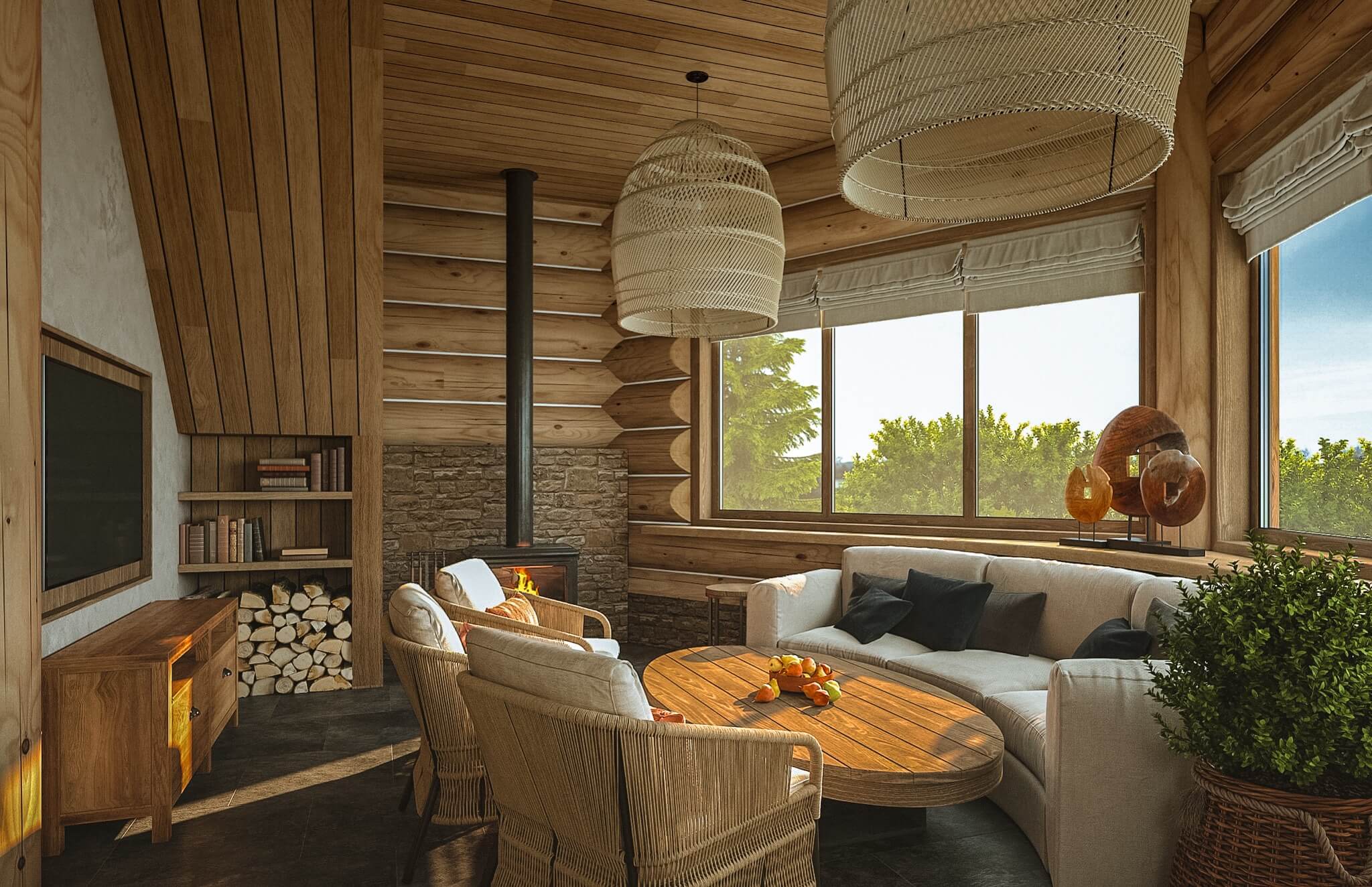 Чтобы подчеркнуть светлую атмосферу дома, интерьер должен был состоять из натуральных материалов и гармонично подчеркнуть сруб. На первом этаже мы положили сланец, деревянная мебель и текстиль выдержаны в натуральных оттенках, и даже ковры в спальнях — это сизаль или, проще говоря, натуральное пальмовое волокно.