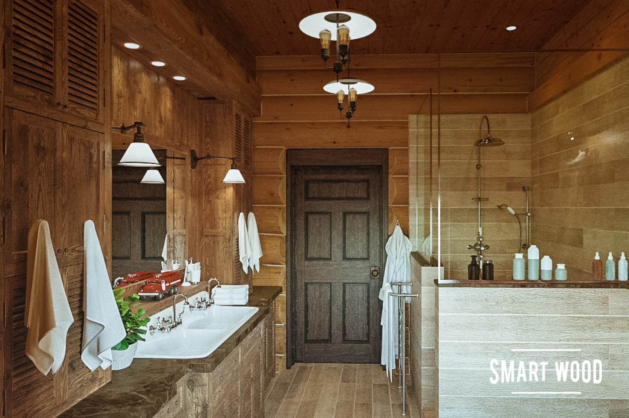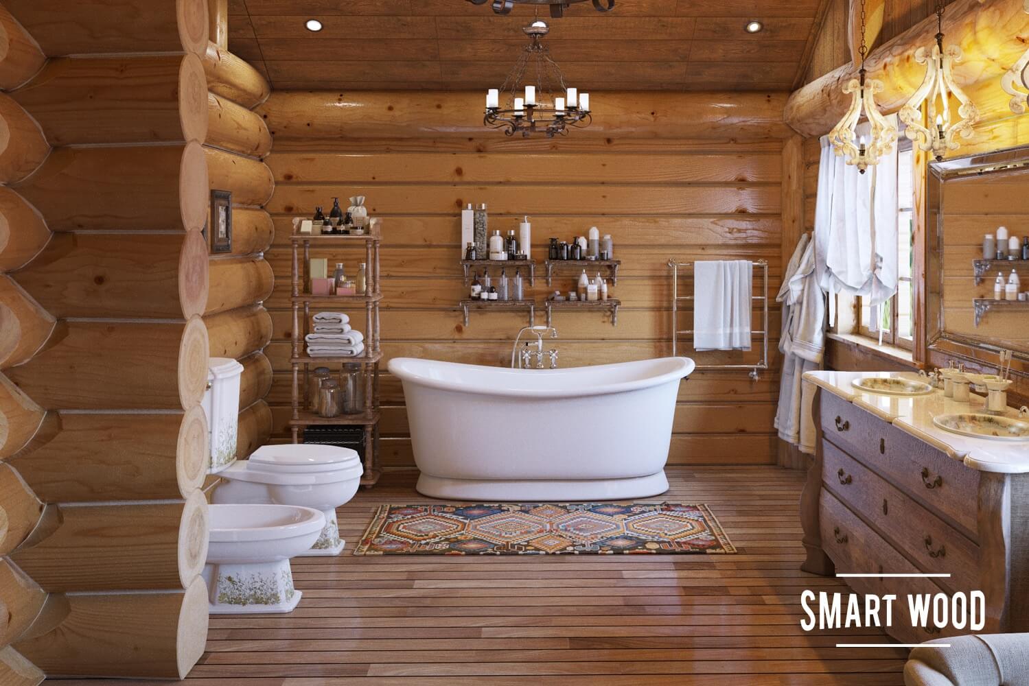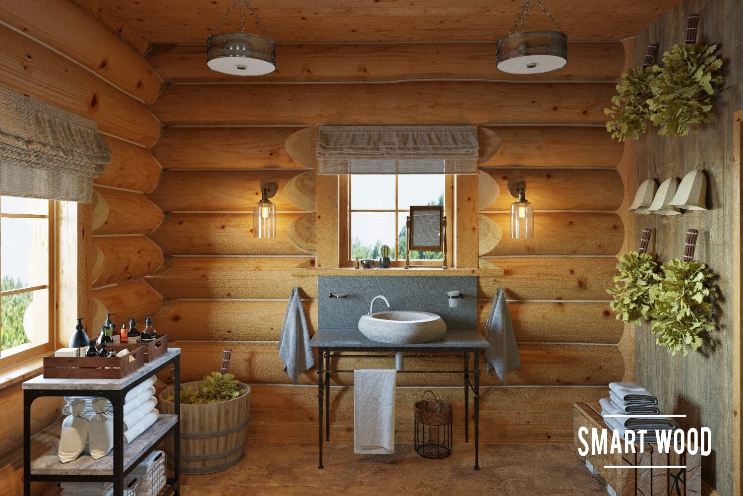 А здесь у нас — прекрасное доказательство того, что деревянный дом может быть очень, не побоимся этого слова, изысканным изнутри — на примере снова ванной комнаты, но уже для взрослых. В глаза сразу бросается контраст — изящные линии ванной и яркая белизна в противовес почти брутальным выпуклым стенам. Добавили немного латуни и оригинальную люстру, оживили все многочисленными баночками и флакончиками и все — выходить отсюда уже не хочется.