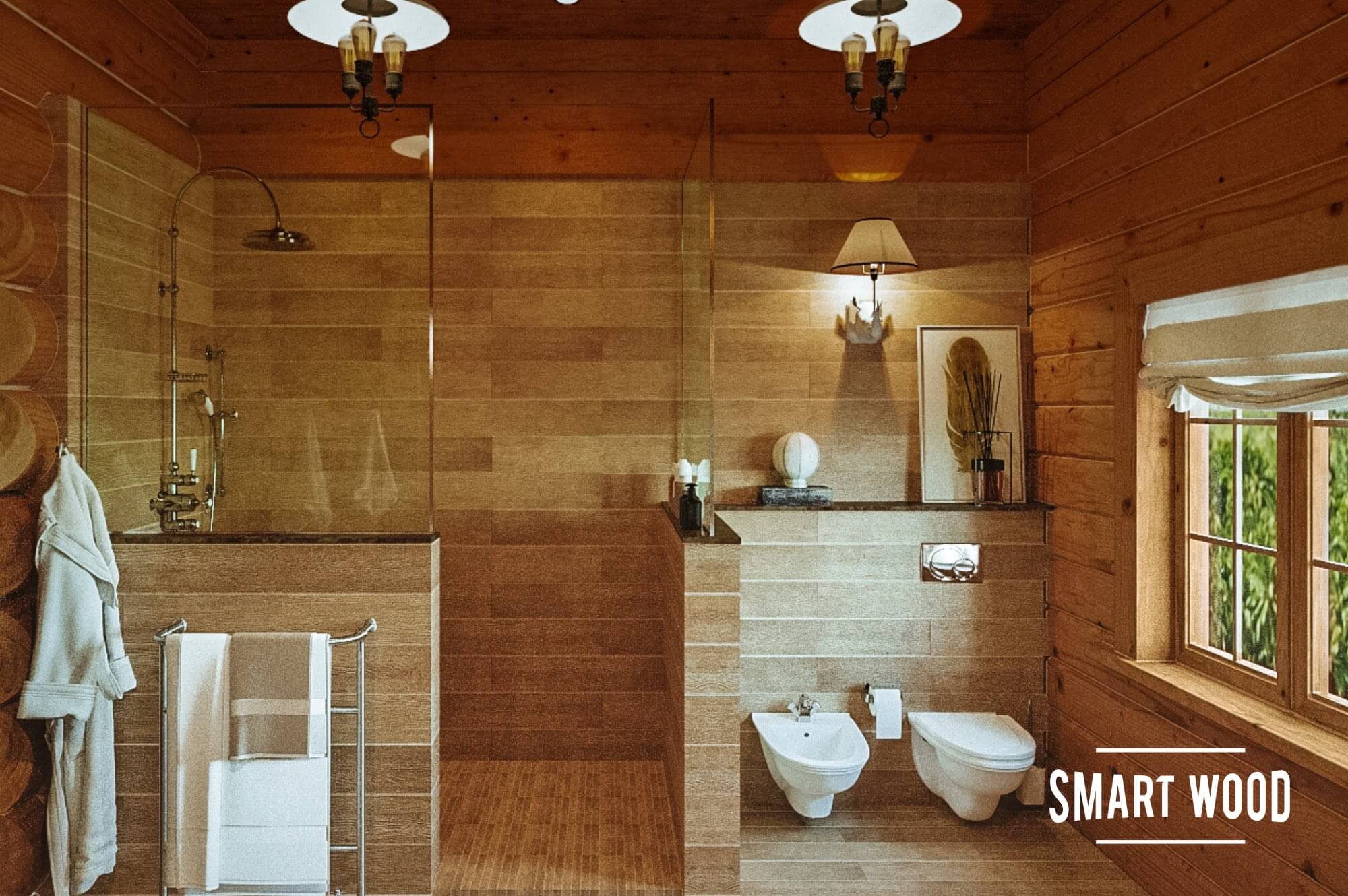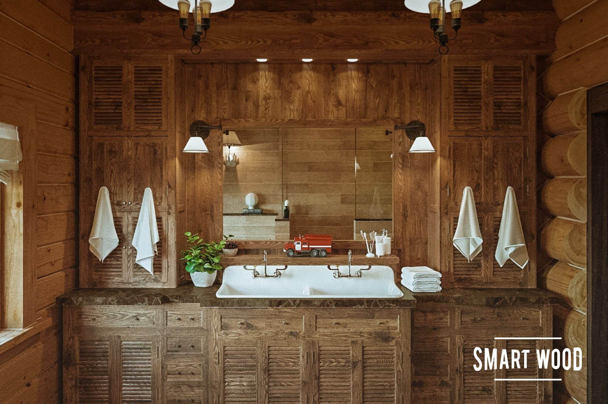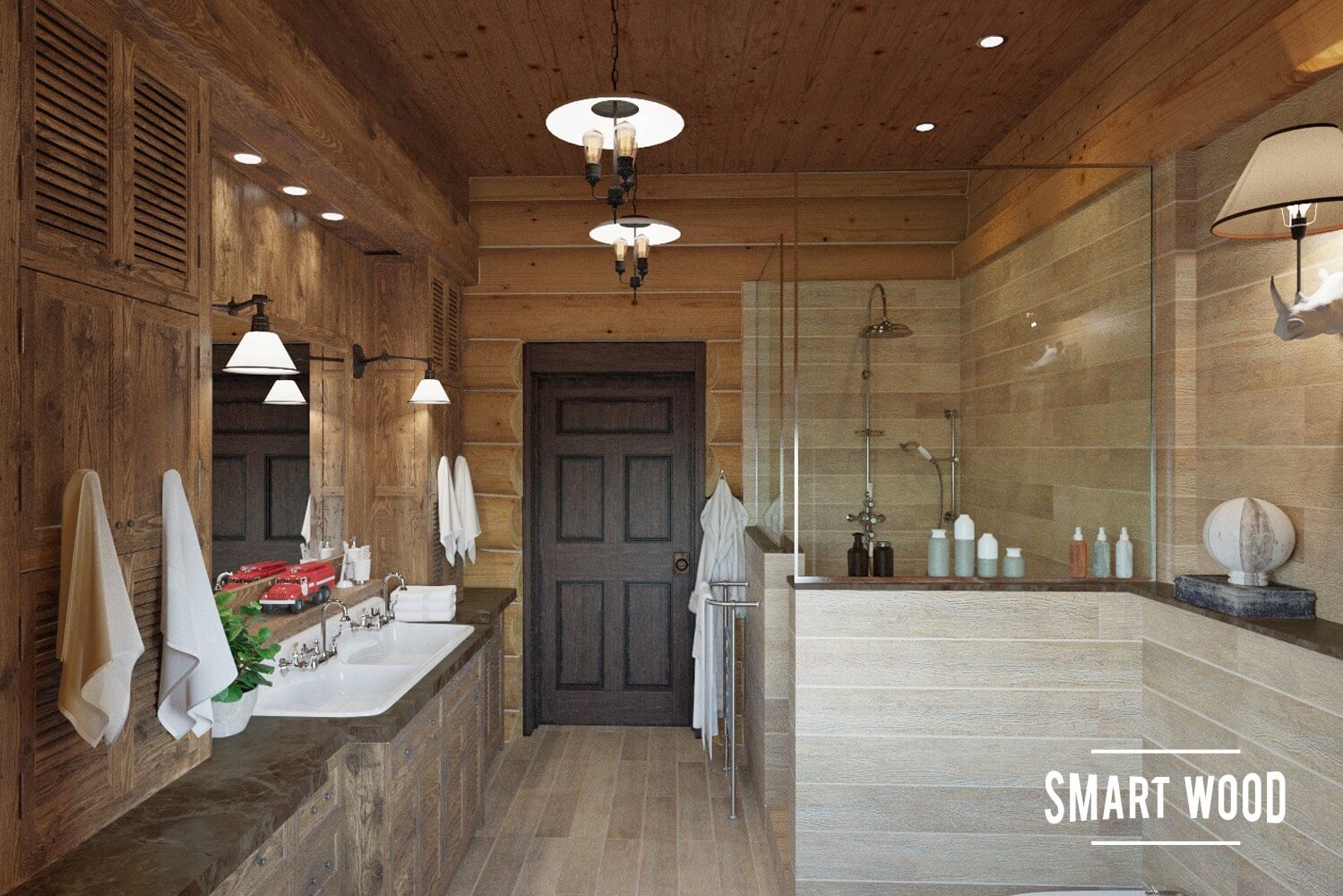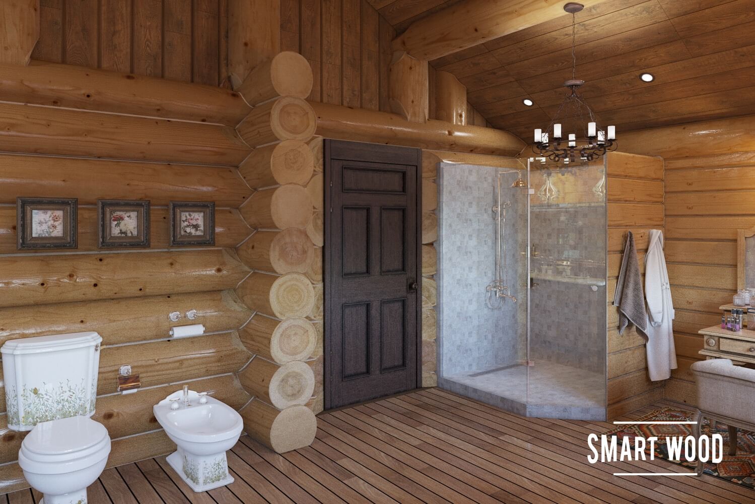 А здесь у нас — прекрасное доказательство того, что деревянный дом может быть очень, не побоимся этого слова, изысканным изнутри — на примере снова ванной комнаты, но уже для взрослых. В глаза сразу бросается контраст — изящные линии ванной и яркая белизна в противовес почти брутальным выпуклым стенам. Добавили немного латуни и оригинальную люстру, оживили все многочисленными баночками и флакончиками и все — выходить отсюда уже не хочется.
