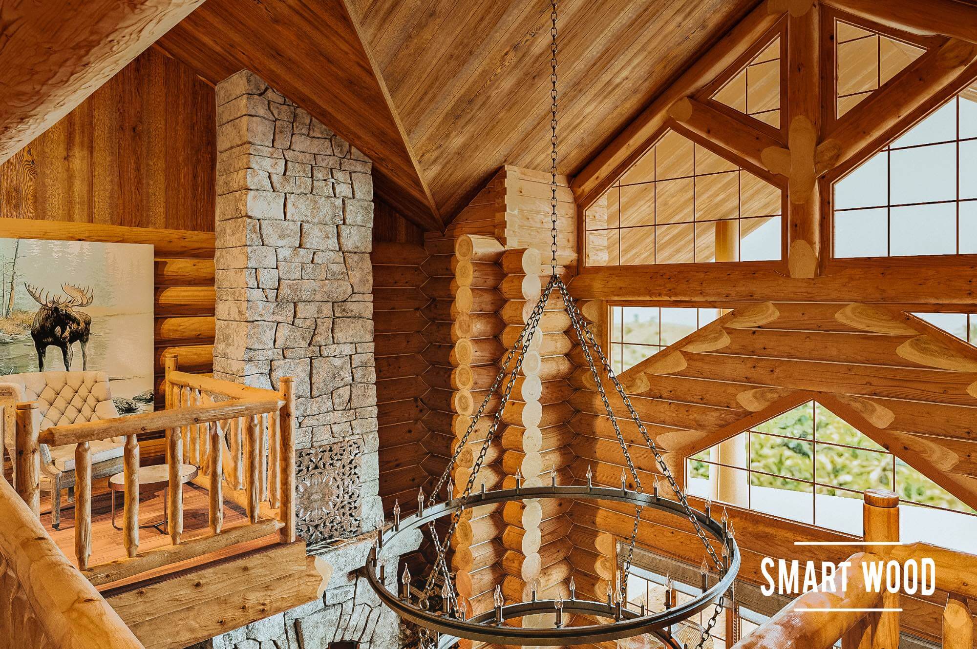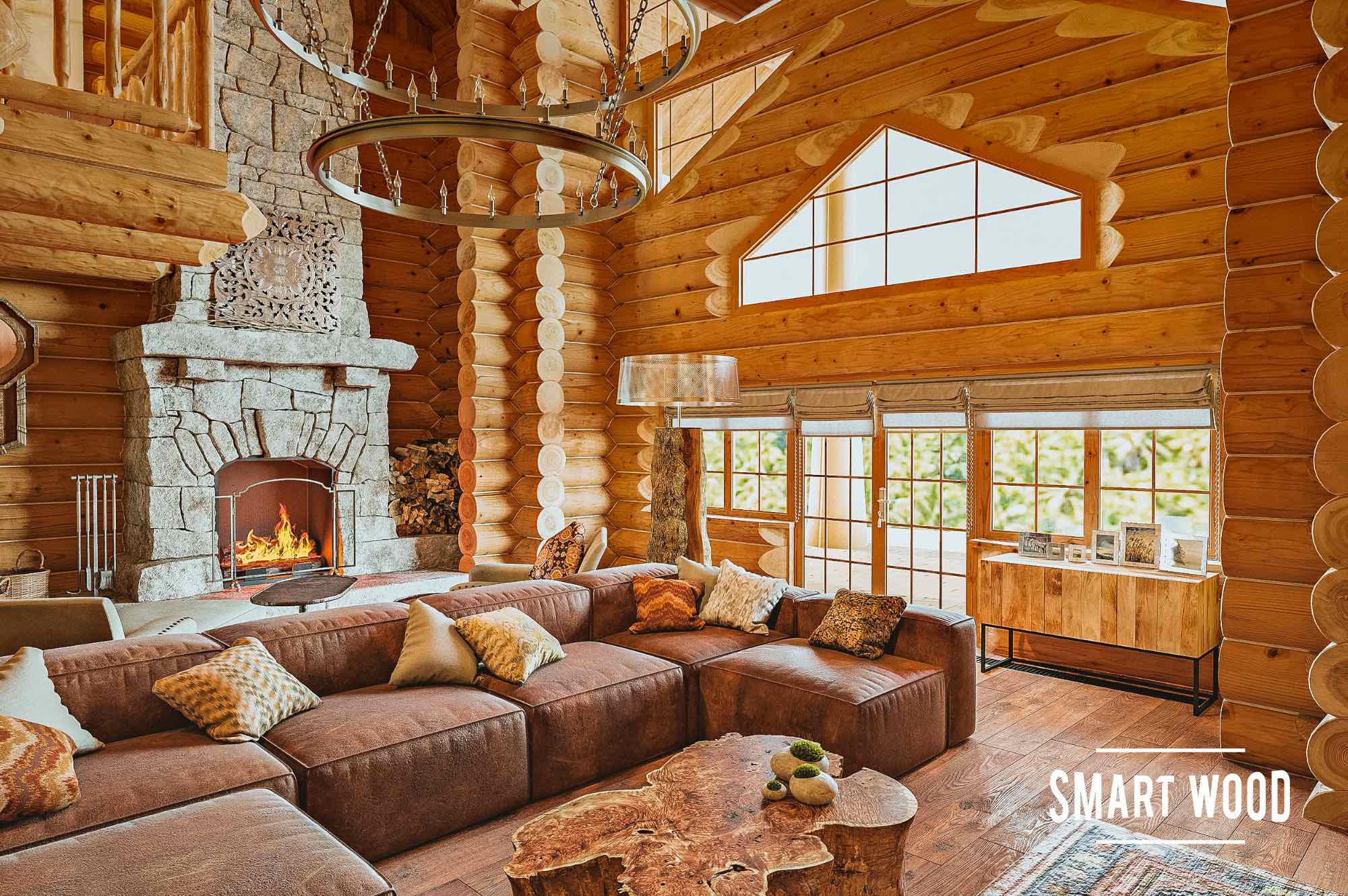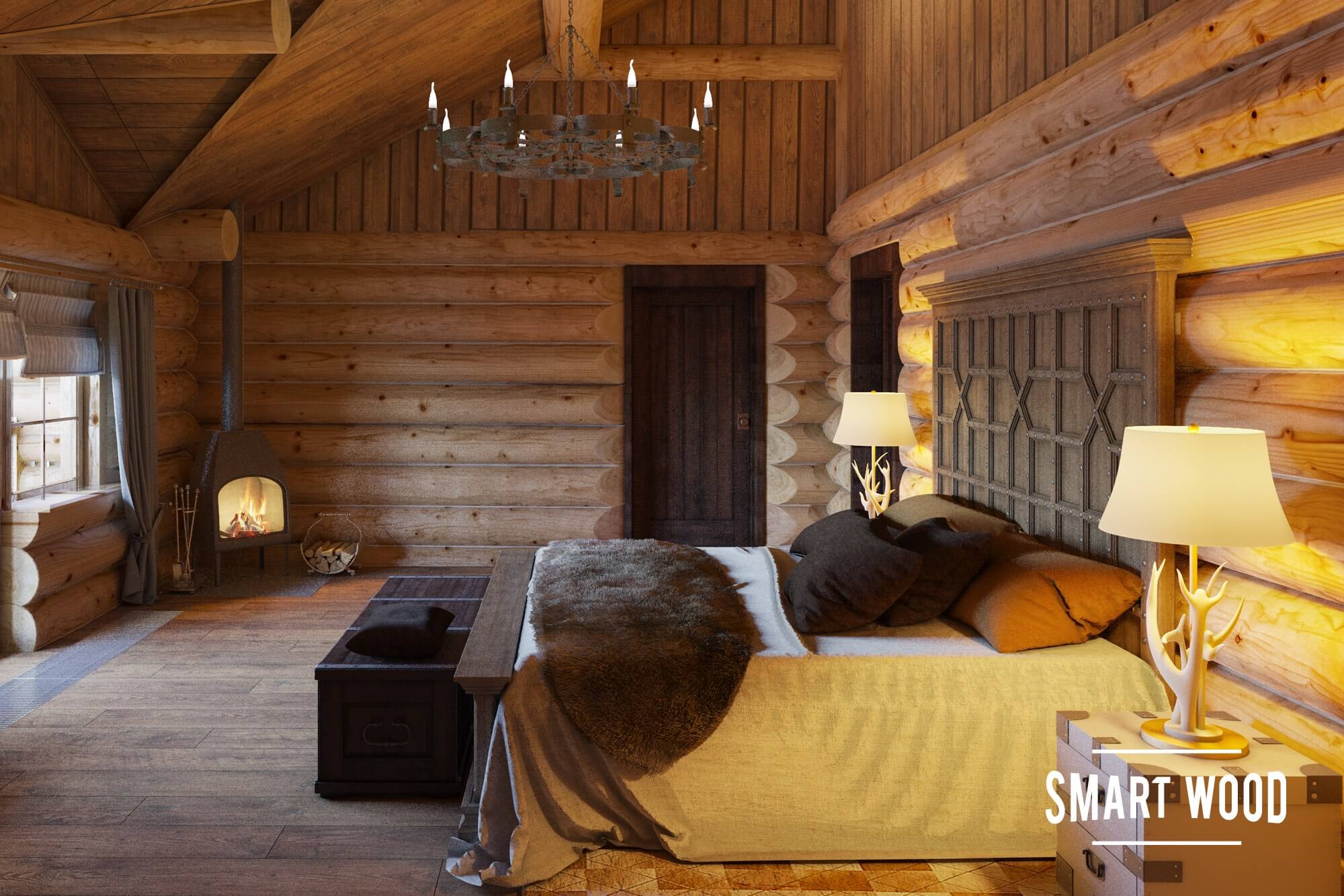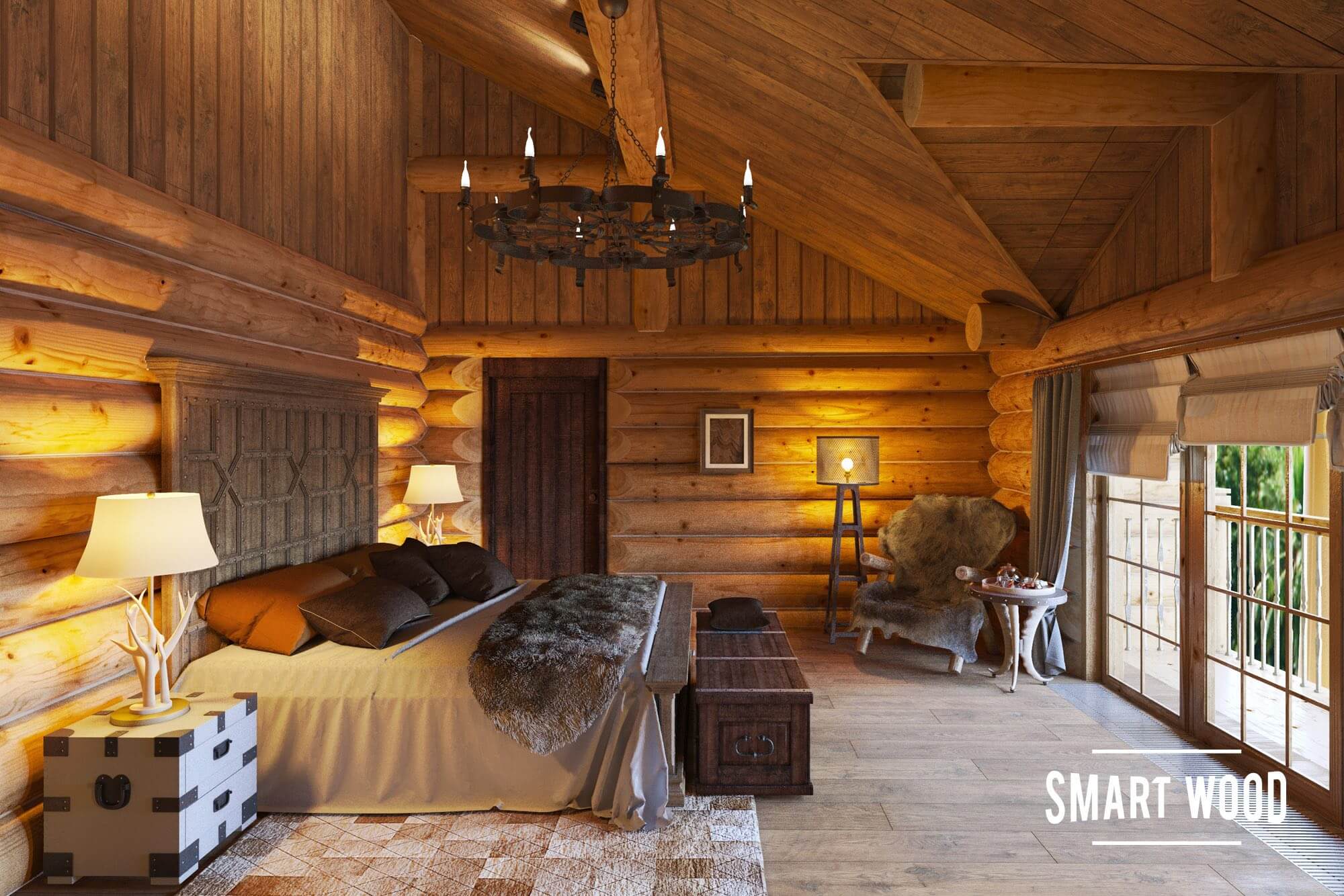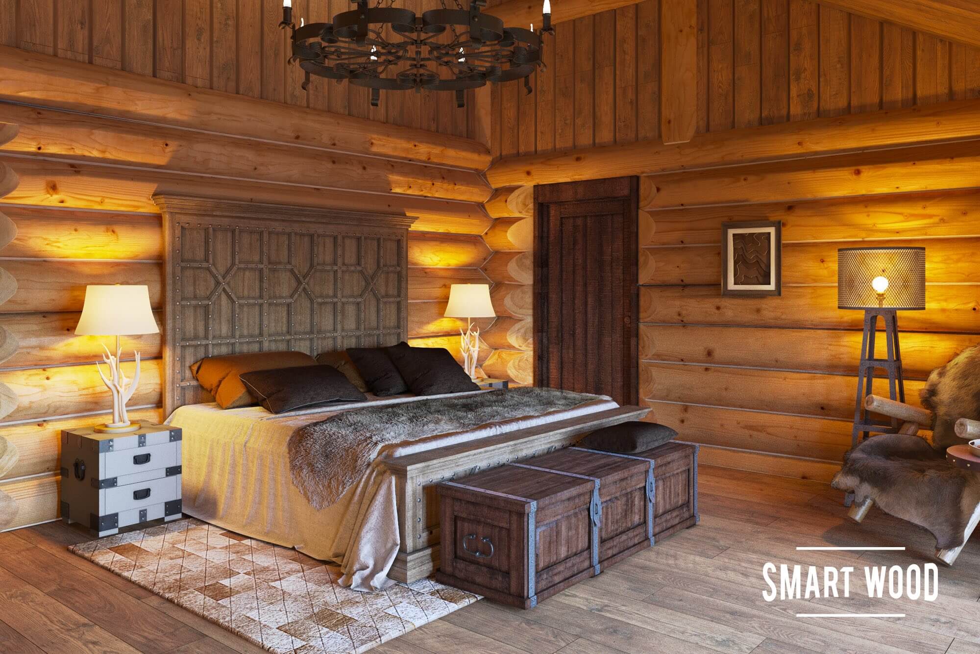 Одно из ключевых пространств в доме — спальня. На фото — классическое ее исполнение. Такая хороша тем, что ей почти не нужен никакой дополнительный декор, только подходящая мебель и правильное освещение. Остальную работу по обеспечению уюта и спокойного сна делают рельефные стены, аромат дерева и разнообразные текстуры.