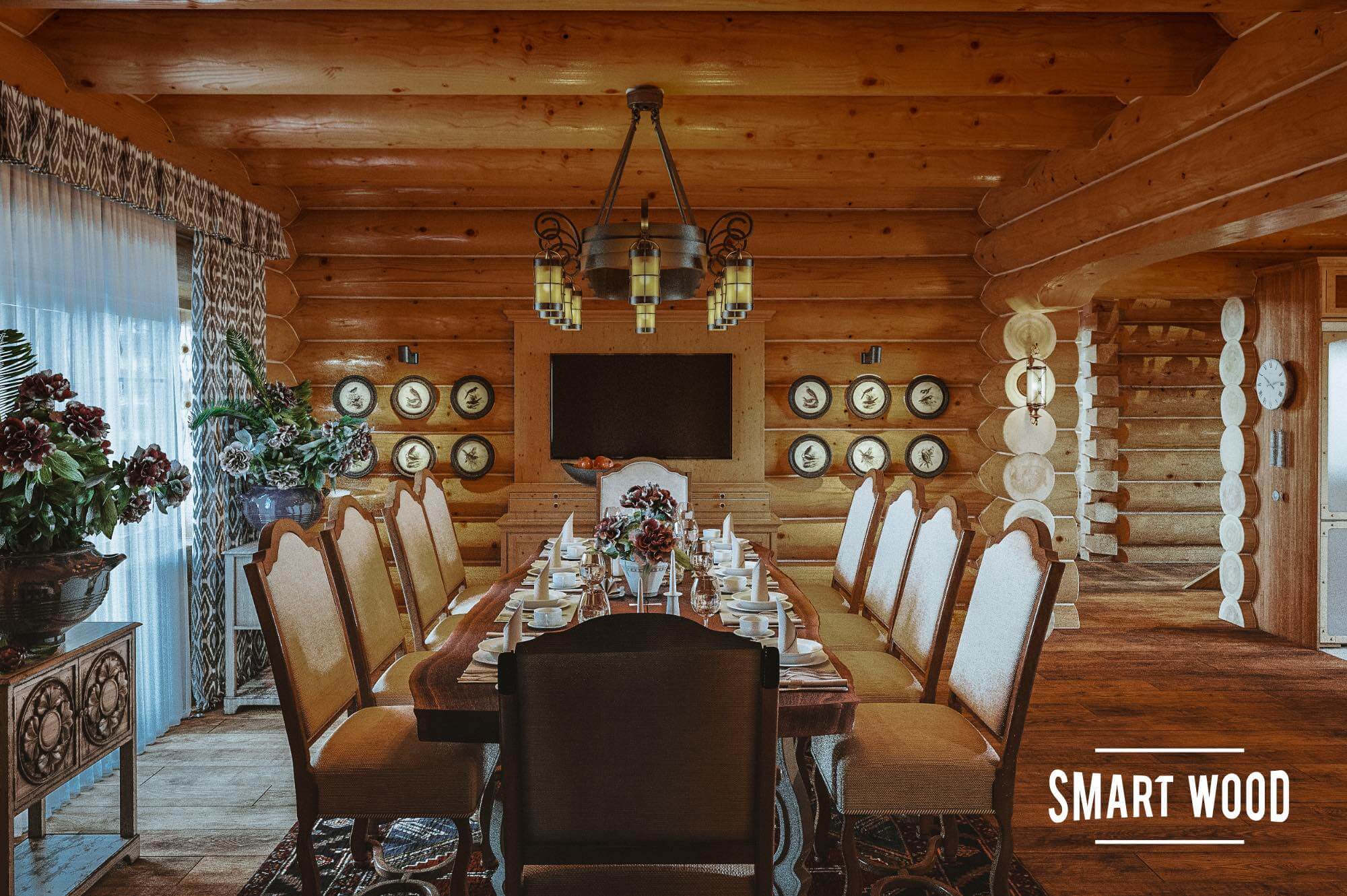 Любое обустройство интерьера в деревянном доме хорошо тем, что любое ваше решение — это дополнение той фактуры, что уже есть. Выпуклые стены, теплые тона, деревянные балки. Мы только добавляем немного деталей, которые отражают вкус владельца. Здесь решено не играть на контрастах и подчеркнуть уют загородного дома. Шикарный стол из цельного спила как точка объединения семьи и гостей, две вариации на темы стульев, яркий ковер и немного изобразительного искусства на стены.