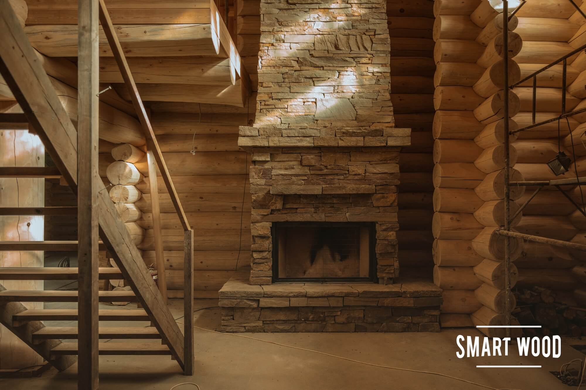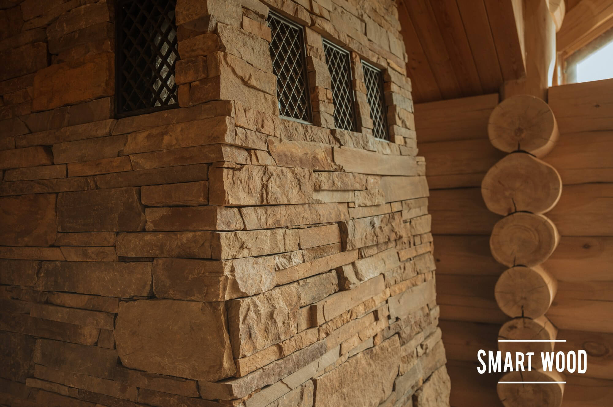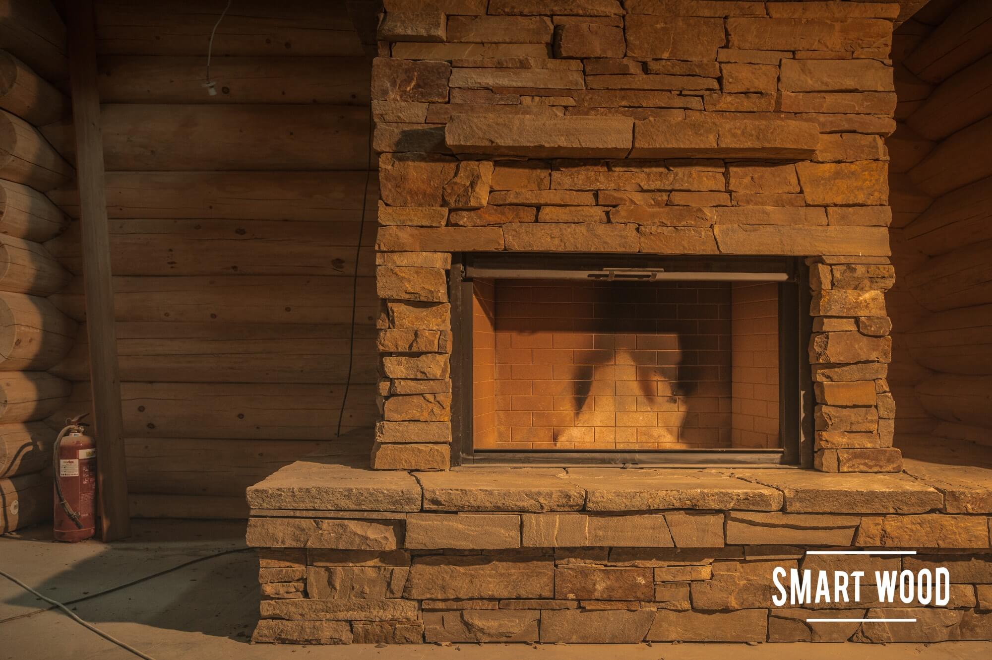 Второй — в стиле модерн, в настроение современной обстановке дома. Тот же песчаник, но спиленный одинаково тонко и аккуратно сложенный, нижняя полка — каменная, верхняя – из бревна кедра.