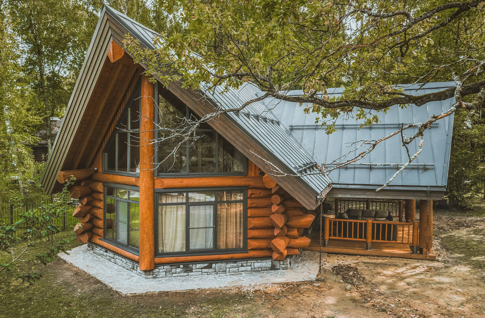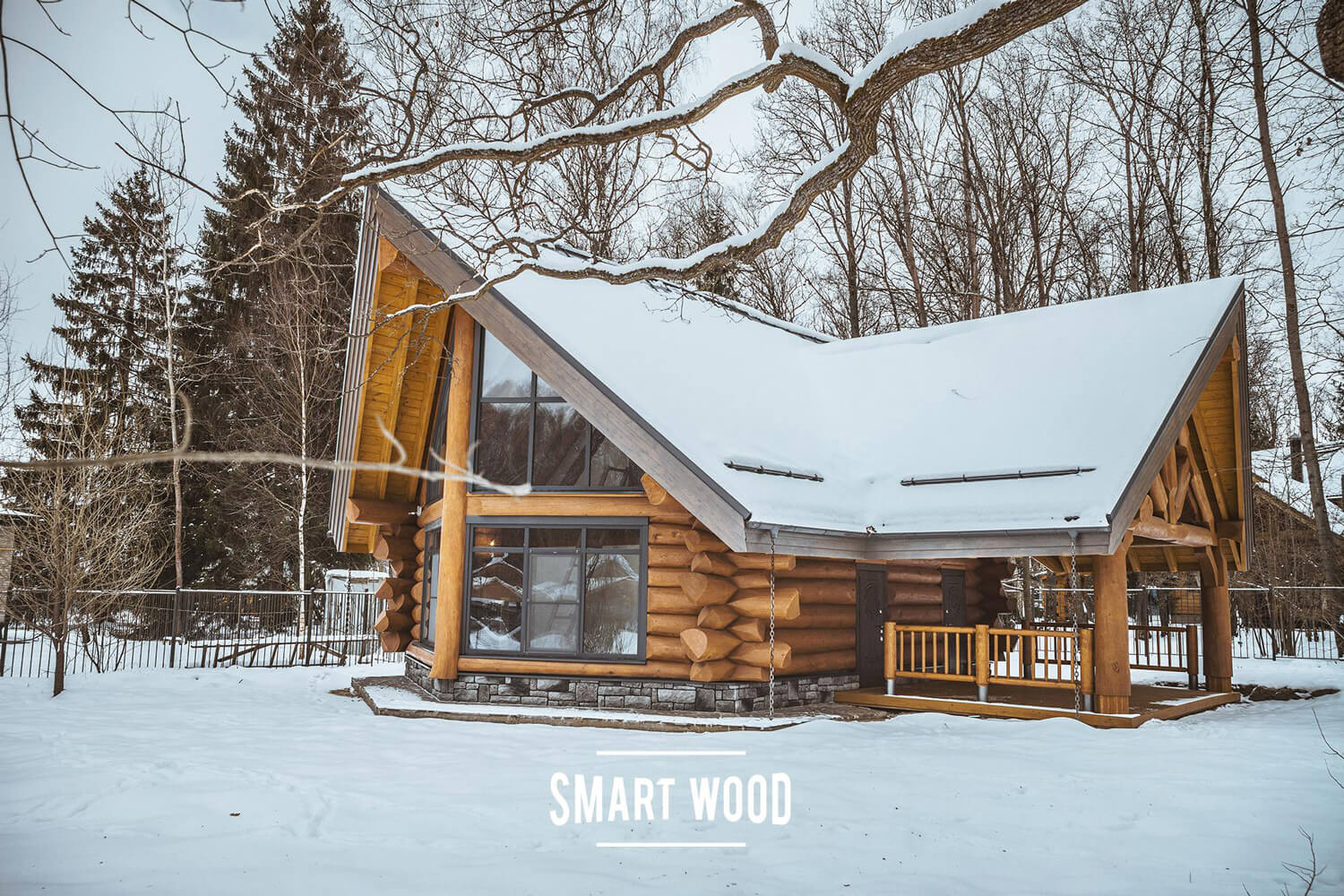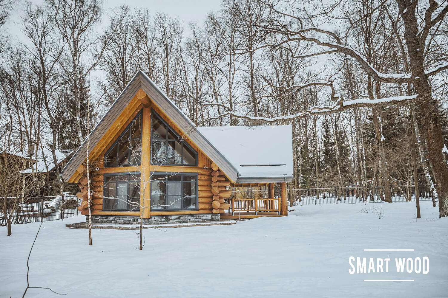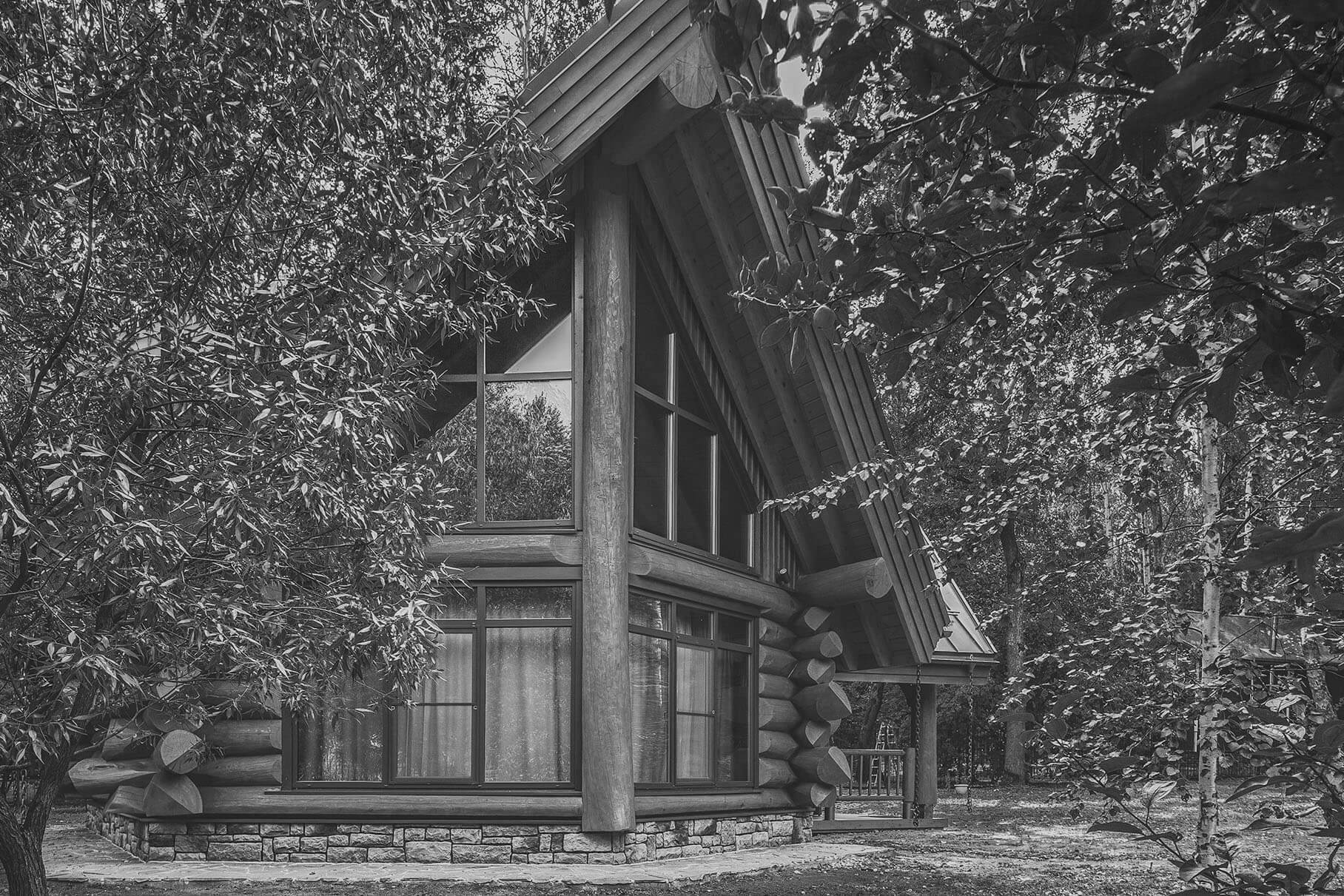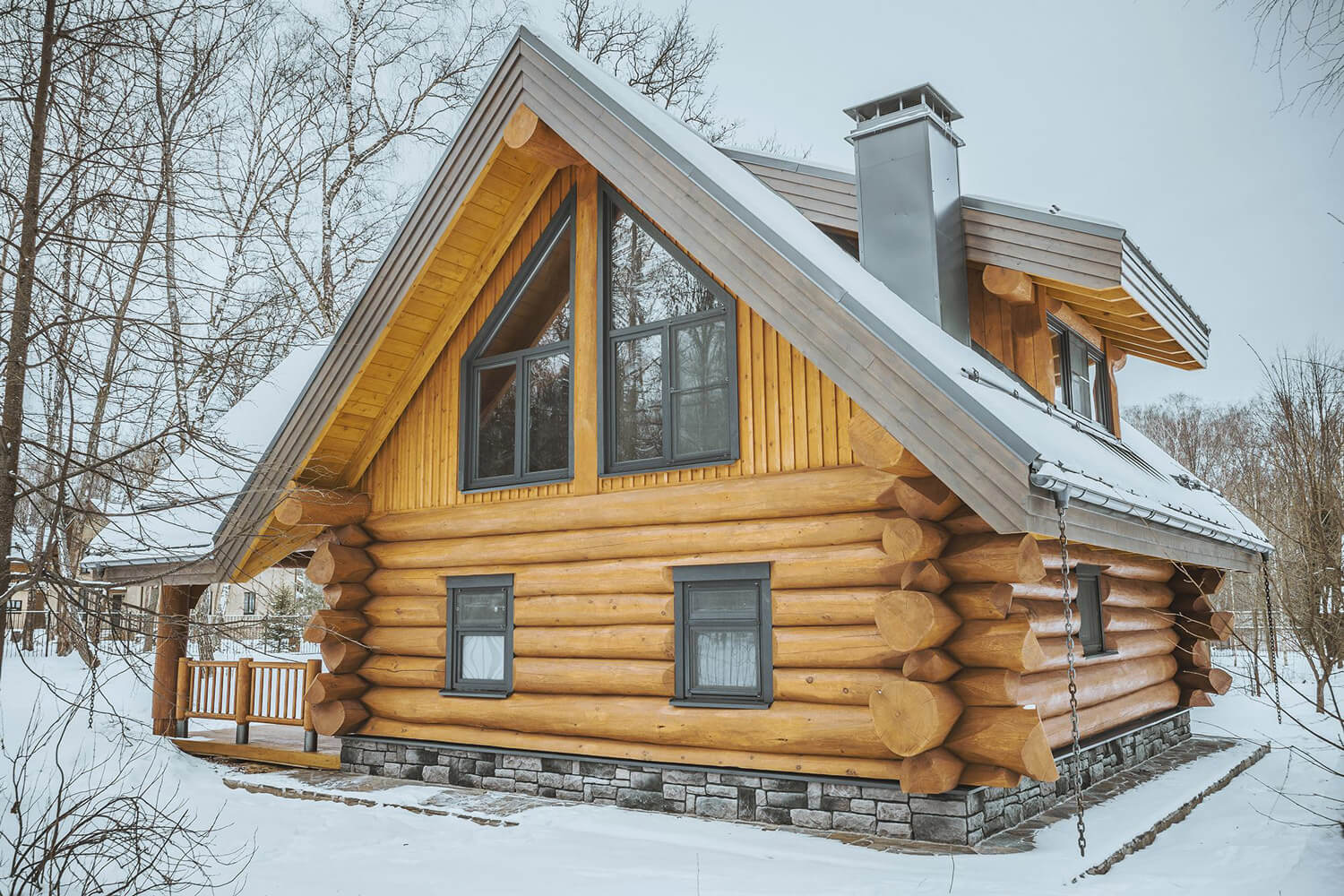 Панорамное остекление делает его стильным снаружи и очень воздушным и светлым внутри. Для строительства мы использовали сибирский кедр от нашего постоянного поставщика, от 380 мм в вершине. Первый этаж собран из бревна по классической усадочной технологии, угловое соединение — бриллиантовая канадская чаша с двумя щеками. Второй этаж — мансарда — каркас Post&Beam.