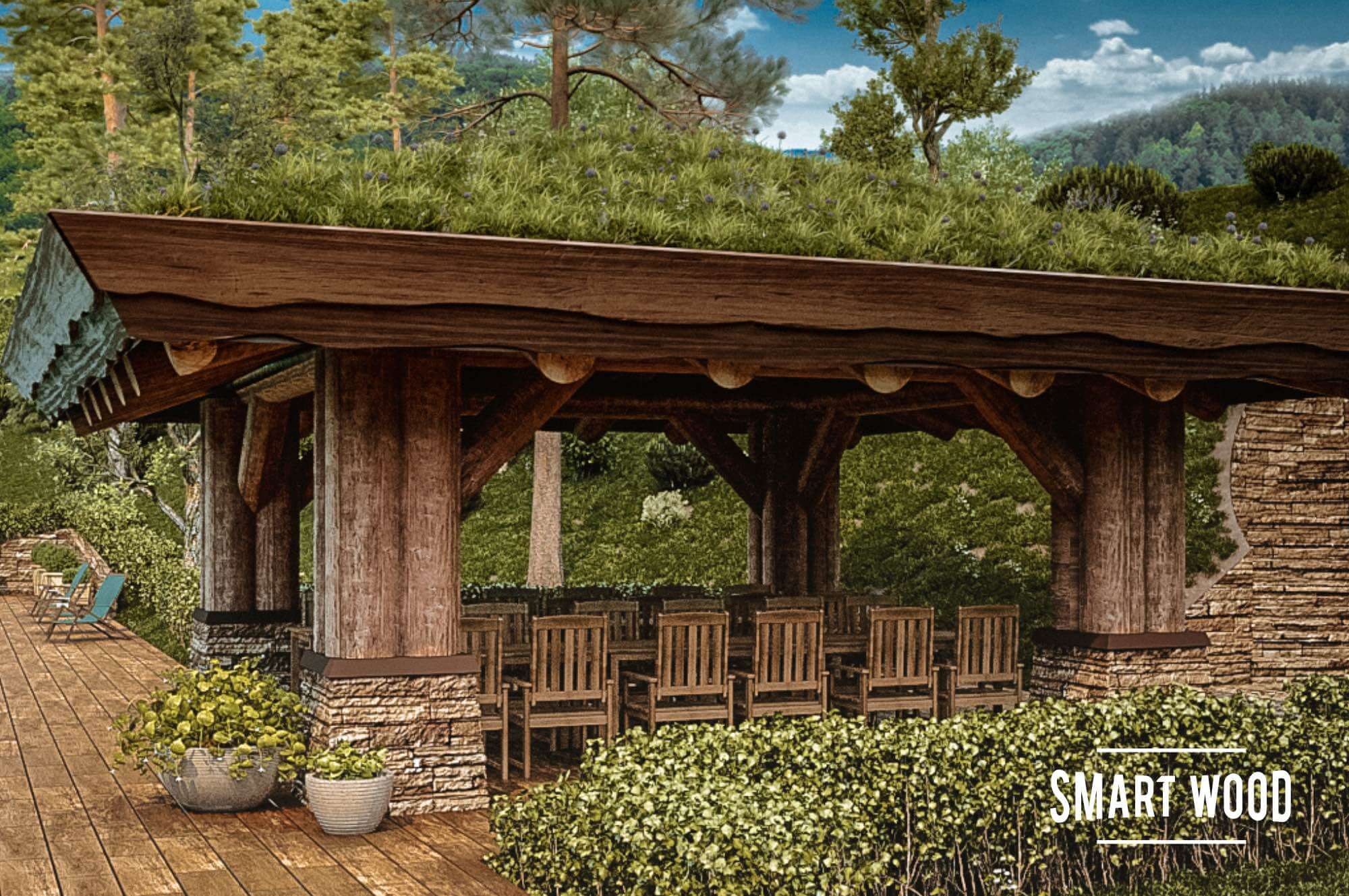 Беседка — четвертая, самая миниатюрная из всех построек, площадью 23 м2, но при этом — самая, наверное, оригинальная часть комплекса. Наиболее интересным здесь кажется сочетание небольшого масштаба беседки, счетверенных колонн и бревенчатых стропил. Они придают ей какой-то природной массивности и самобытности, которые мы решили подкрепить земляной кровлей.