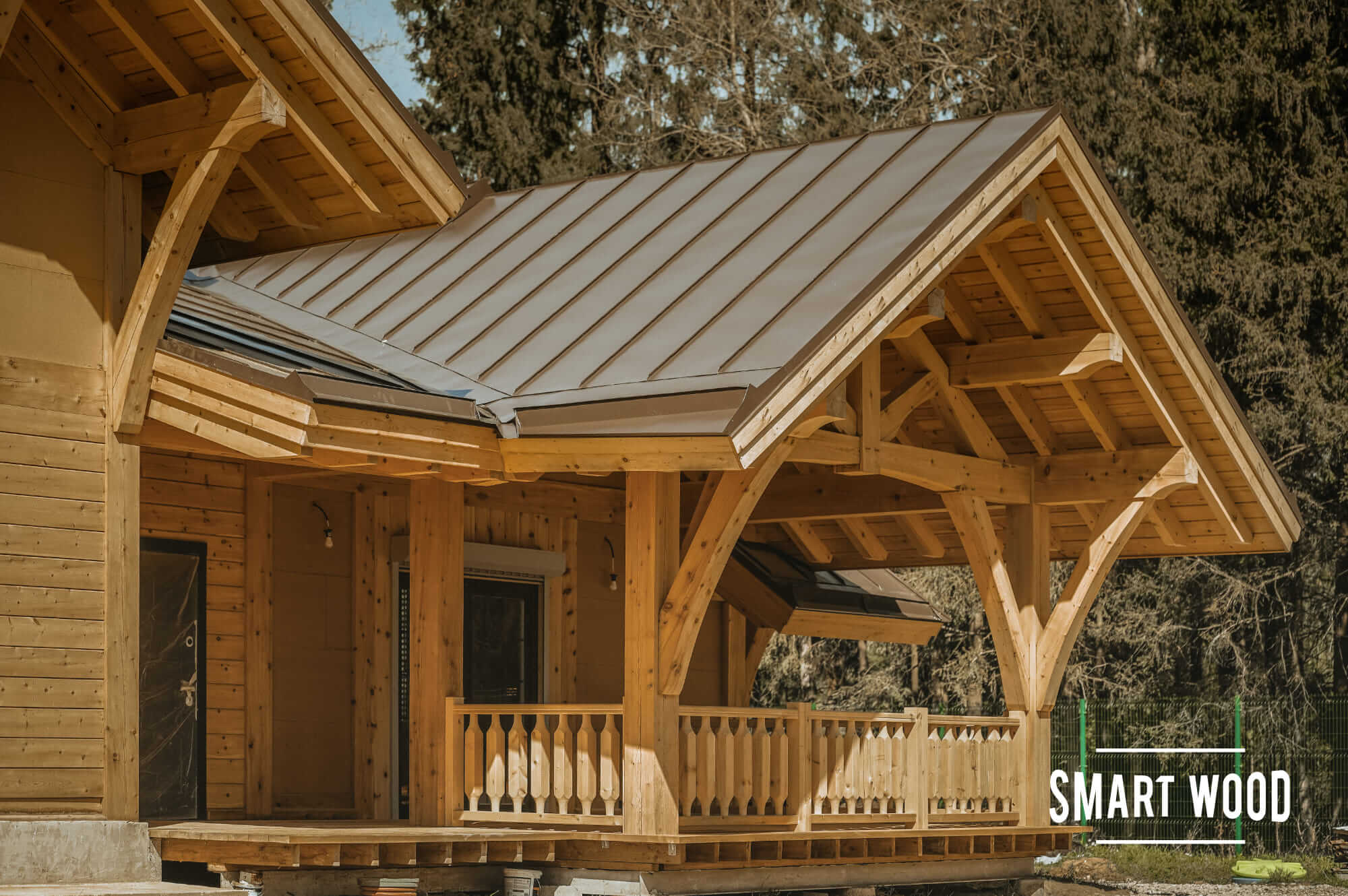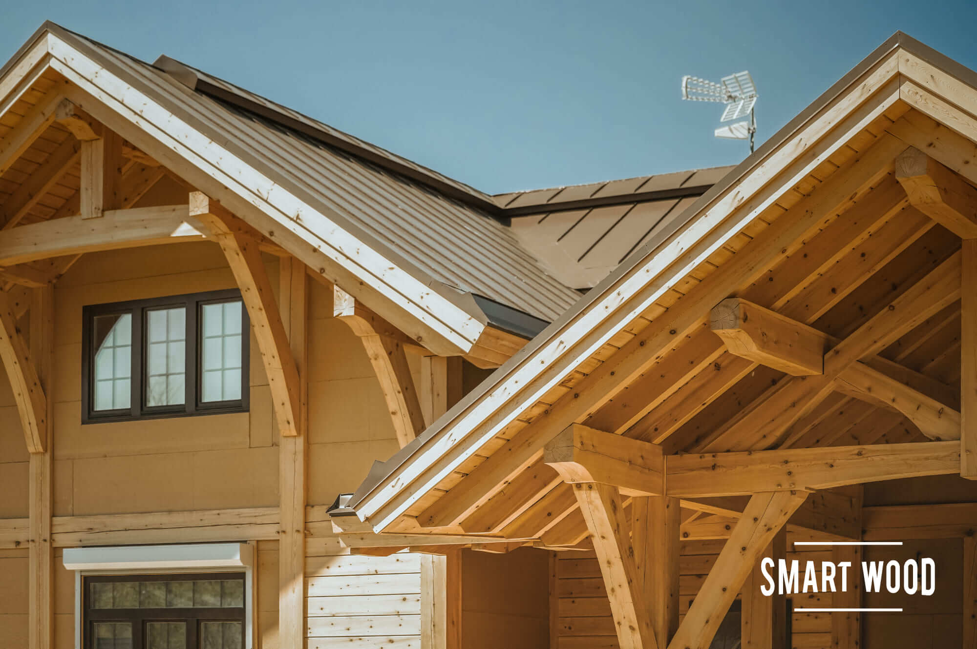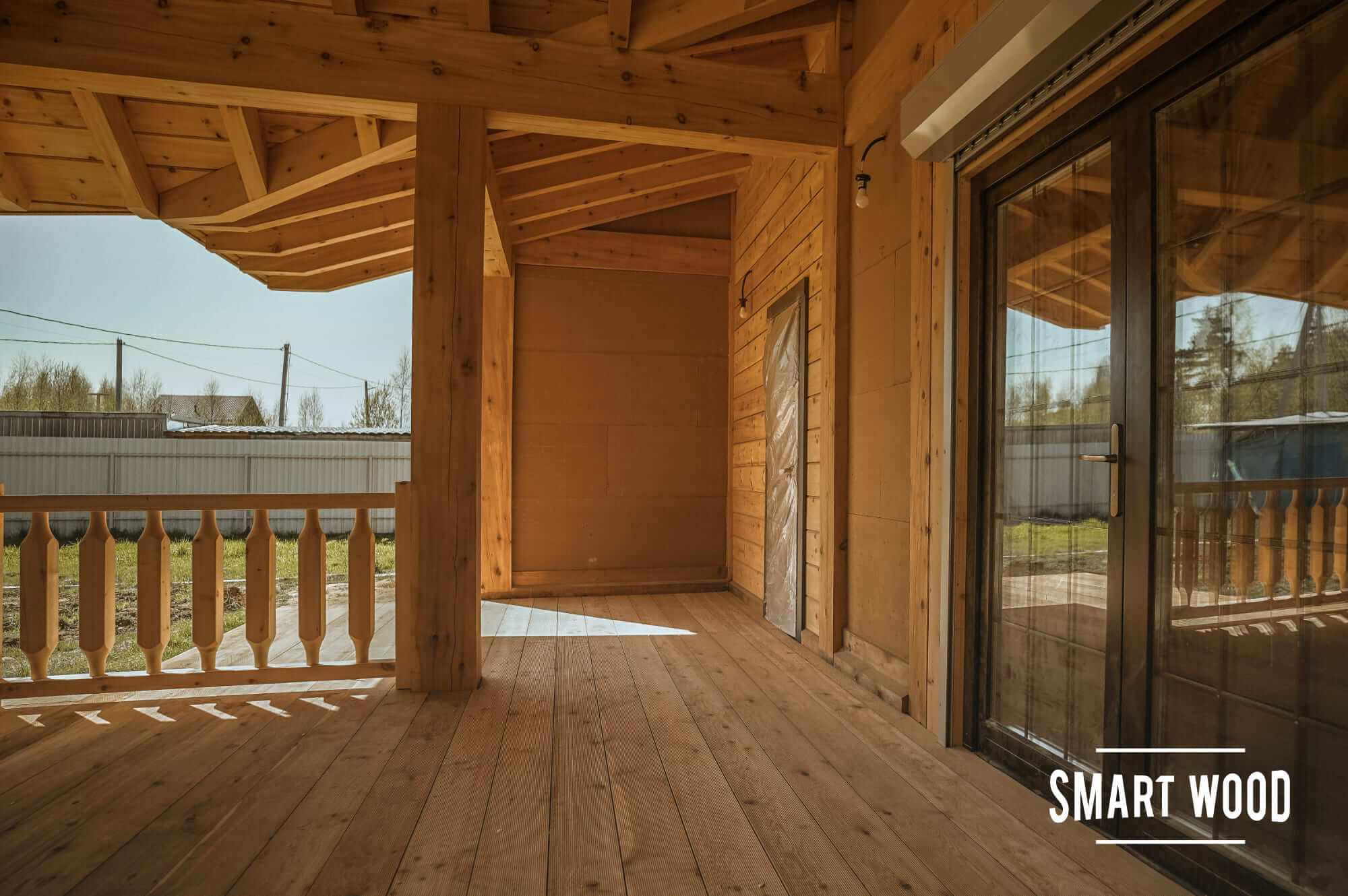Второй вариант — силовой каркас открыт и в интерьере, и в экстерьере. Конструктивно сложнее: необходимо сделать герметичное примыкание заполнения простенков к силовому каркасу. Но зато мы можем полноценно использовать всю красоту сложных соединений Timber Frame в архитектурном и дизайн проекте.