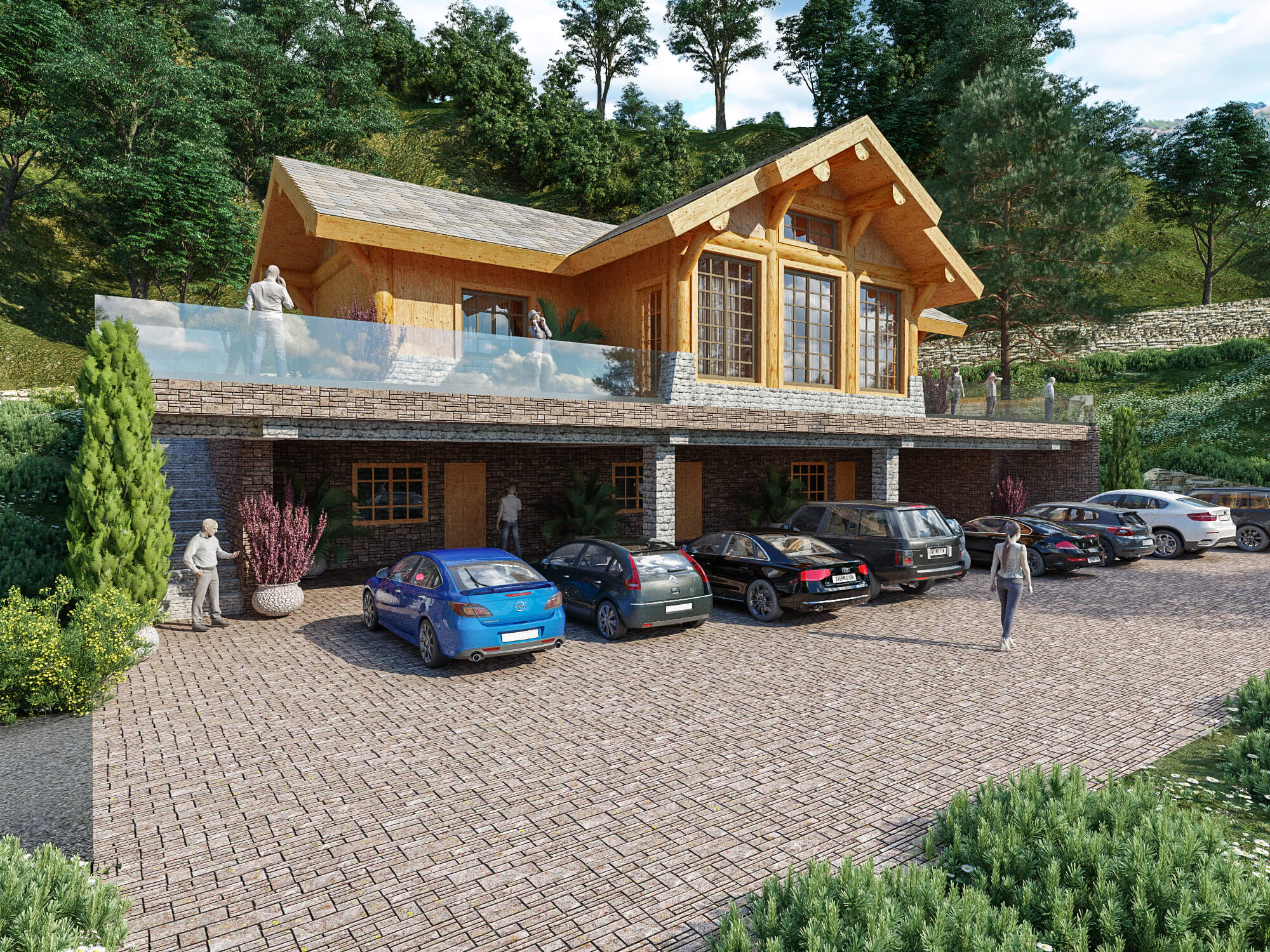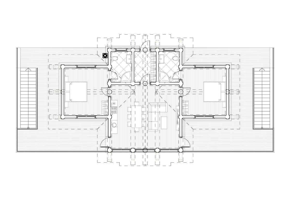 Второй этаж — деревянный каркас Post&Beam. Чтобы не выбиваться из общего архитектурного ансамбля, он будет обшит дранкой, как и часть фасадов остальных строений комплекса. Здесь проектом заложены несколько уютных жилых комнат с кухней и ванными для сотрудников комплекса — горничных, садовника и охраны