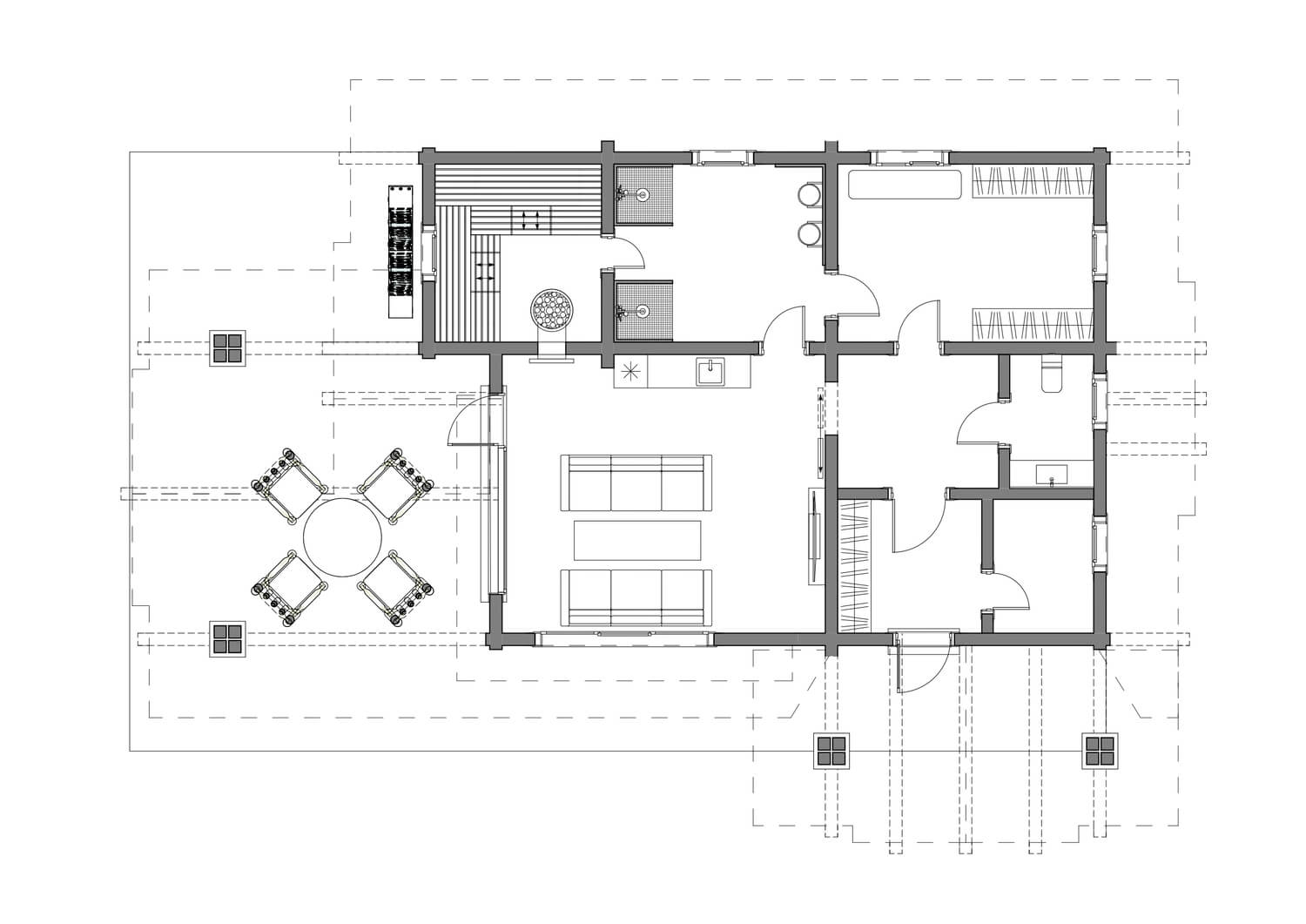 Внутреннее пространство бани поделено на парную, помывочную, раздевалку, санузел и большую комнату отдыха. Прихожая отделяет тамбур и техническое помещение от основной зоны для комфорта хозяев и гостей.⁣⁣⠀