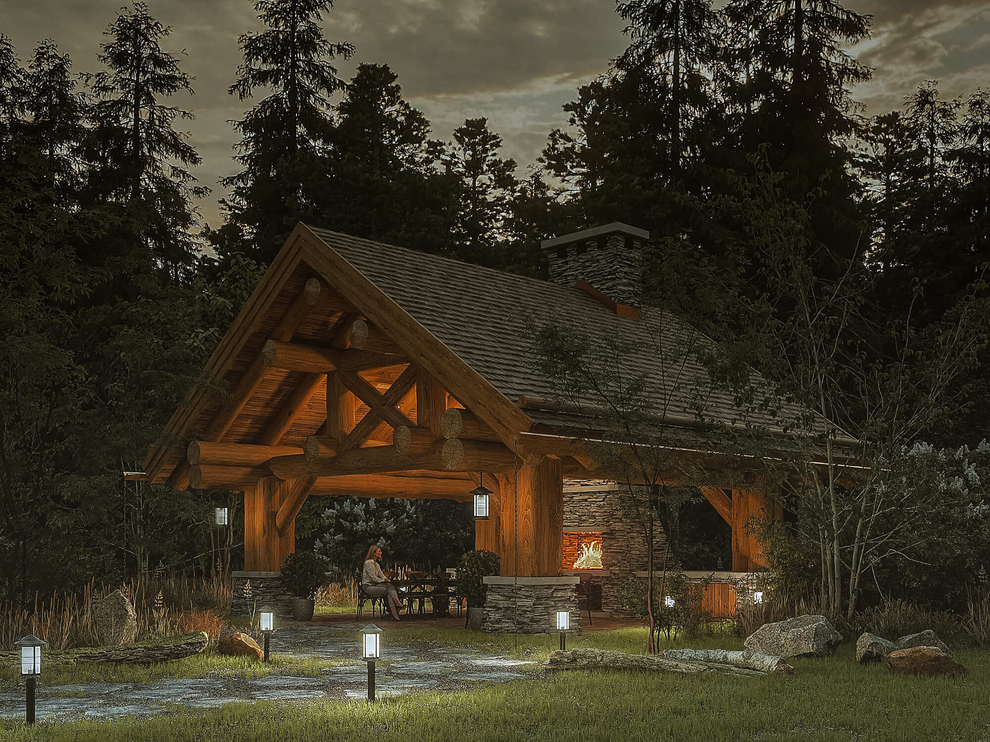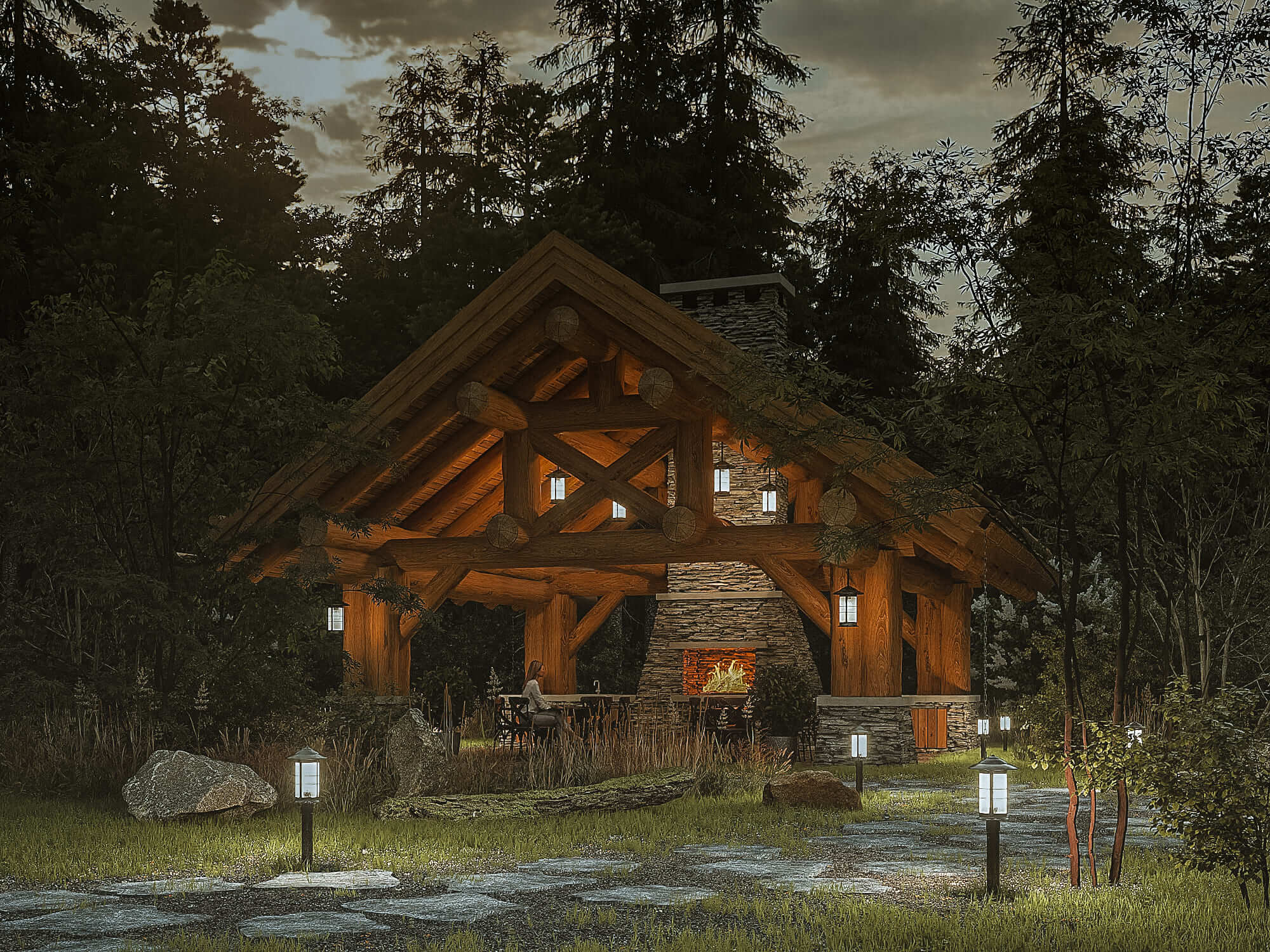 Проект беседки «Тойма» — это кухня-столовая на свежем воздухе, место, где можно приготовить барбекю и провести время с друзьями и семьей. По нашей задумке беседка будет выполнена из сибирского кедра, достаточно крупного — от 500 мм. в диаметре. Остов беседки — каркас Post&Beam, финишное крышное покрытие кровли — лиственничная дранка. Все это довольно классические и очень лаконичные решения — мы хотели, чтобы такая постройка легко вписалась в любой участок и гармонично смотрелась с любым, уже построенным на нем домом. Характер же ей придают две яркие детали. Первая — крестовая ферма под крышей, которая одновременно несет на себе нагрузку и в то же время делает фасад беседки объемным и запоминающимся.