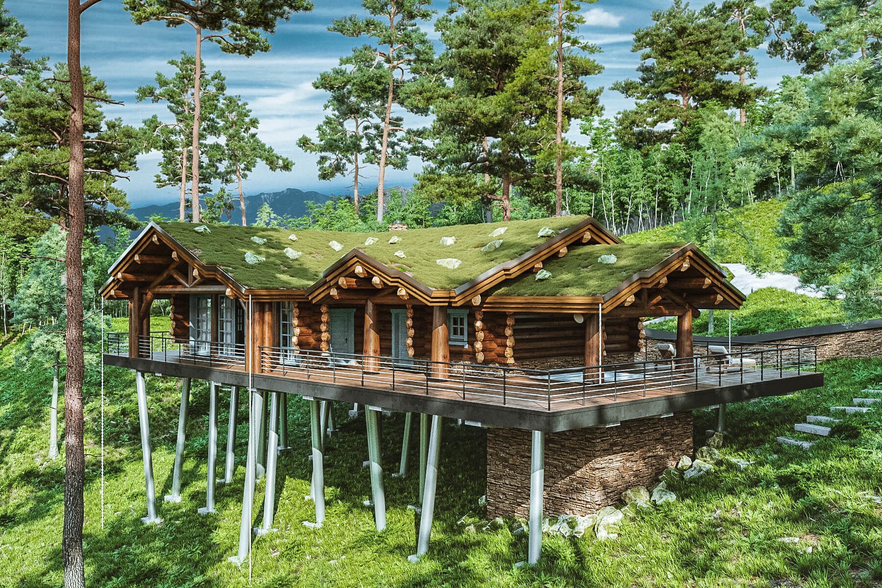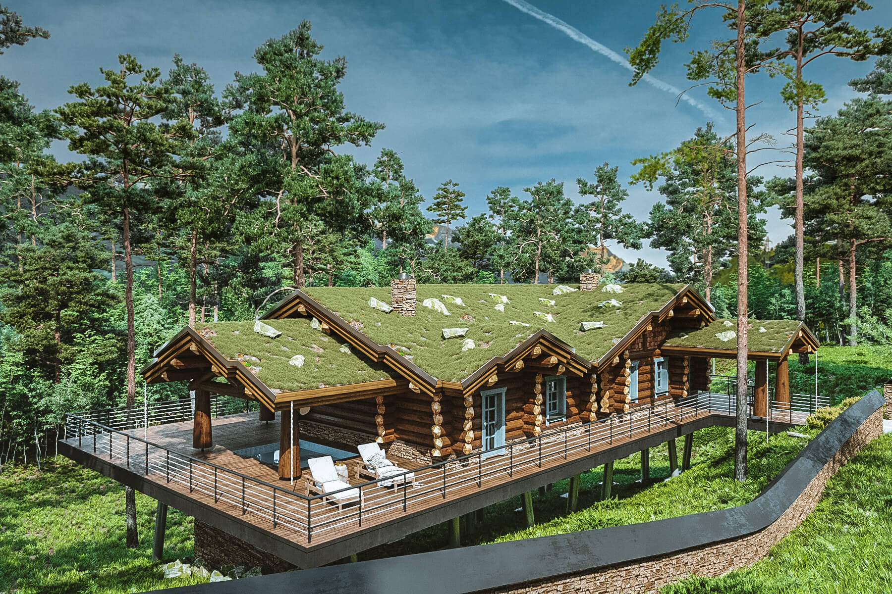 Сама баня — это классический сруб кедра, который мы проработали с особой тщательностью. Один этаж и земельная кровля, поросшая травой и оформленная камнями, полностью вписывают баню в окружающую природу. Этот же эффект поддерживается и массивными колоннами — некоторые из них счетверенные, а некоторые — ординарные, но из конусообразного бревна большого диаметра.