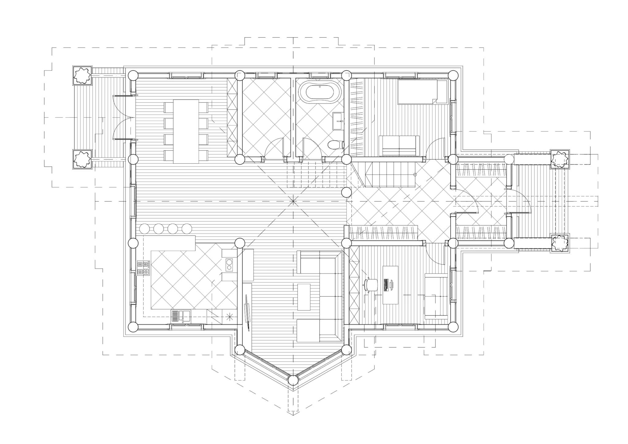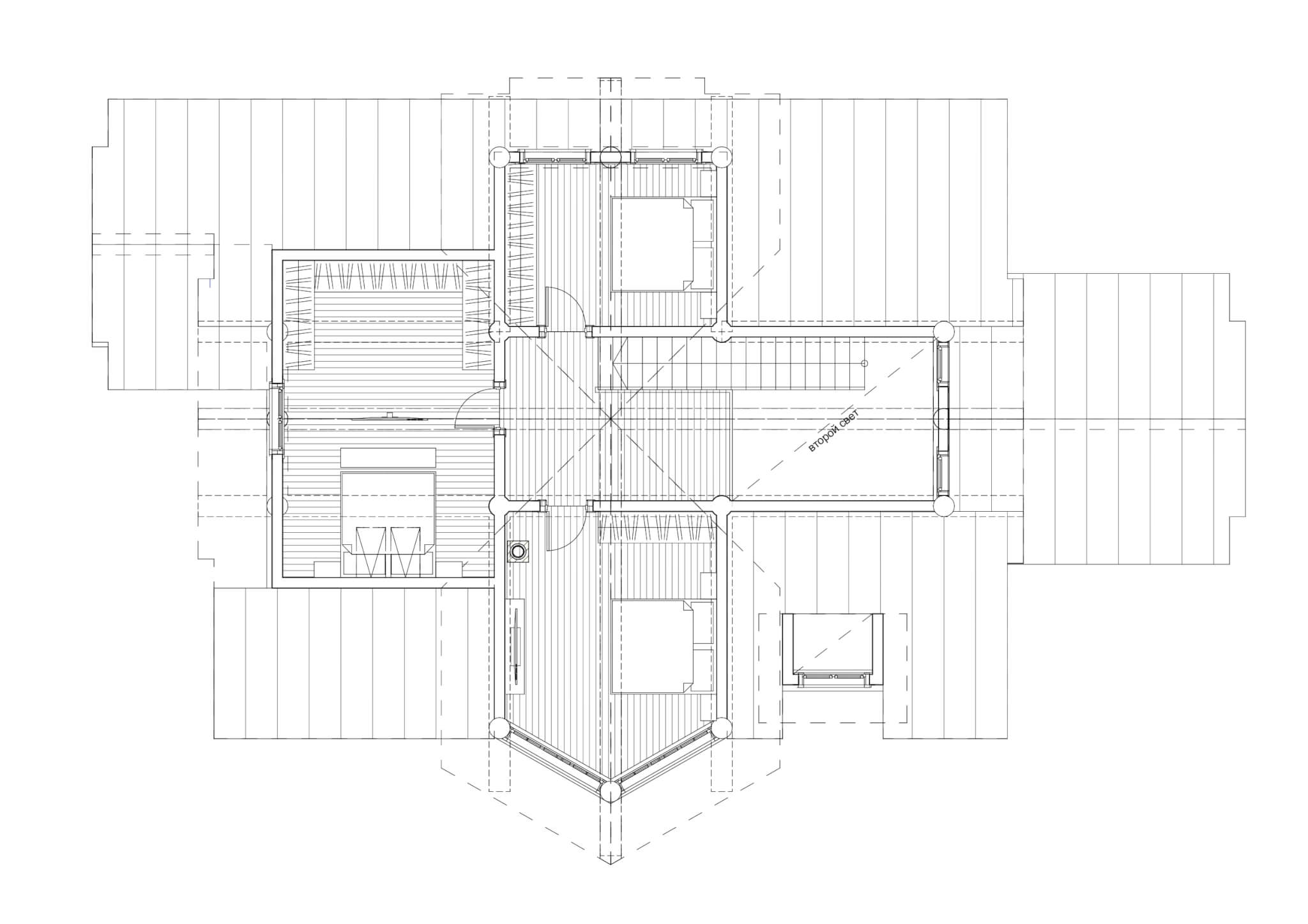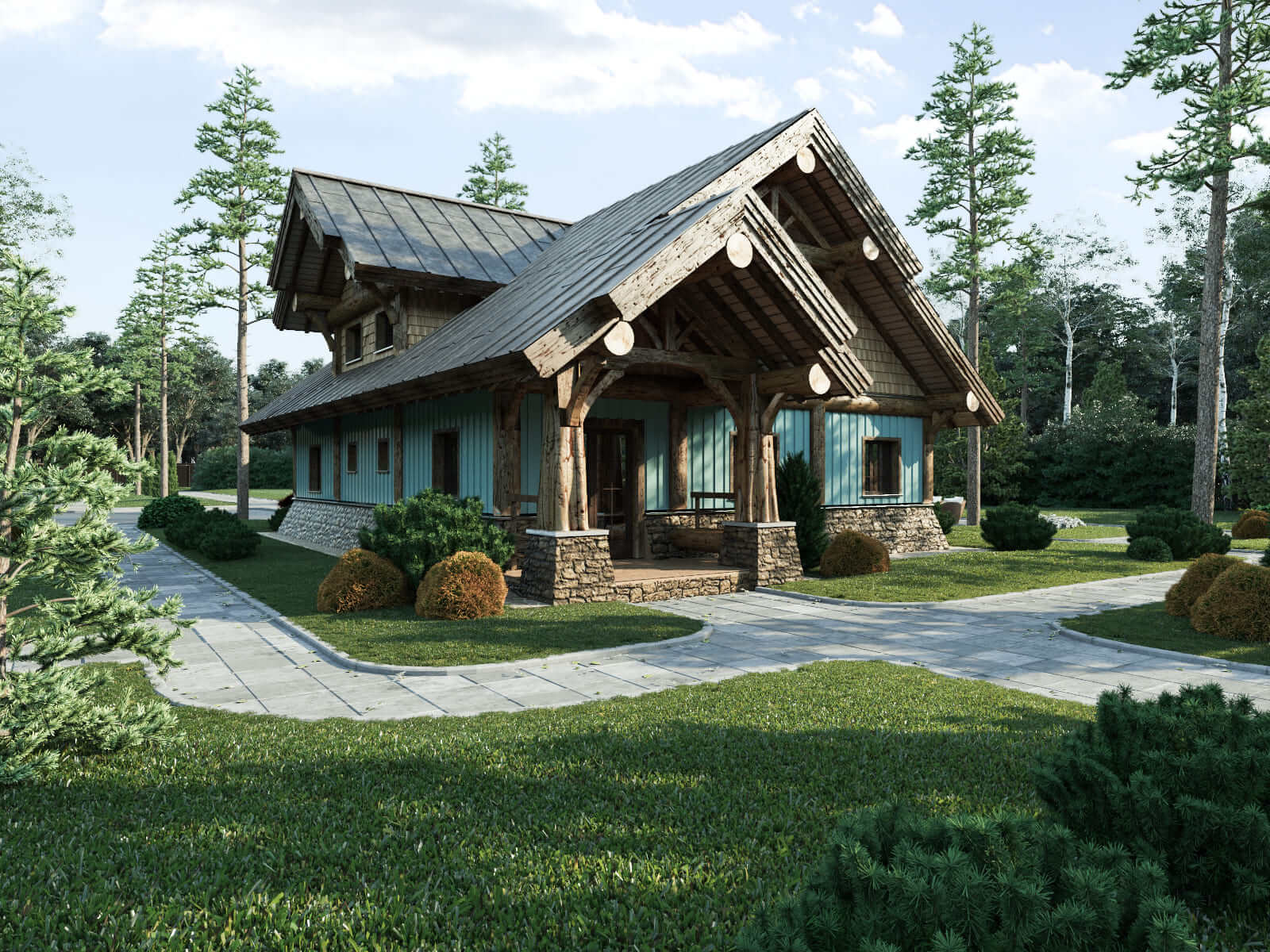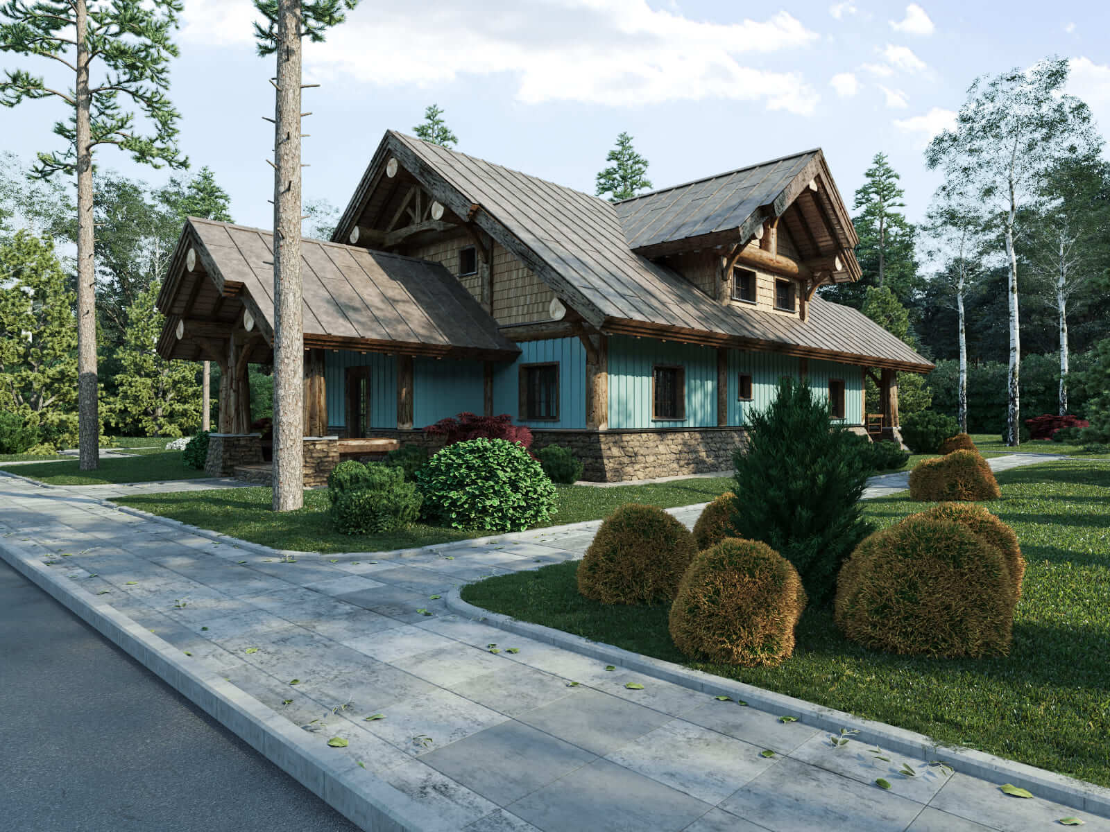 Основной дом на участке, где уже построена баня и гостевой дом «Креплий», «Кутина» продолжает его традиции — ассиметричный фасад, панорамное остекление, высокий каменный цоколь и каркас Post&Beam.