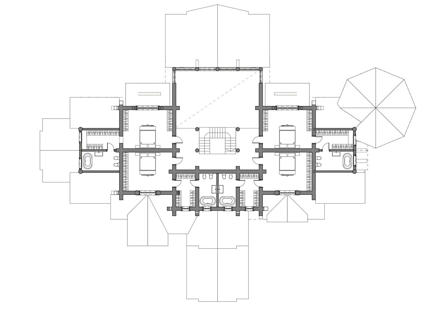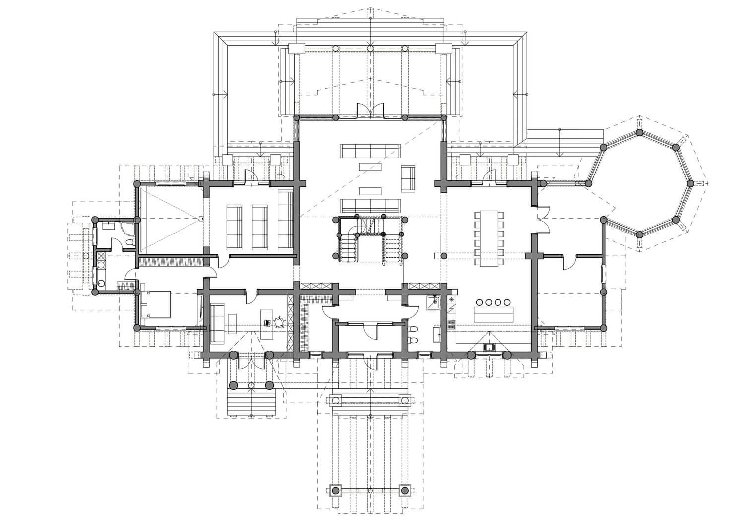 Проект жилого дома и бани в Казахстане. Основное строение комплекса — большой двухэтажный дом с балконами, террасами и пристроенным зимним садом-восьмиугольником. Проектом в нем заложены четыре спальни, гостиная, кухня, столовая с большими свободными проходами и камином. Неподалеку от дома расположится русская баня с панорамным остеклением и массивной дровяной печью.