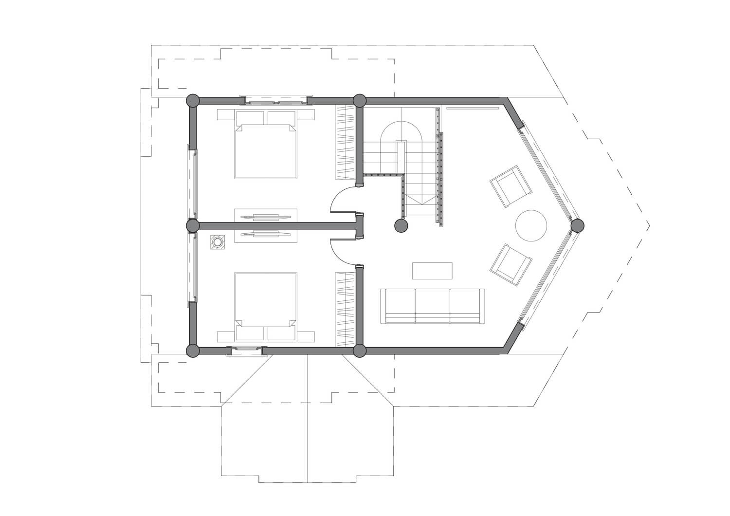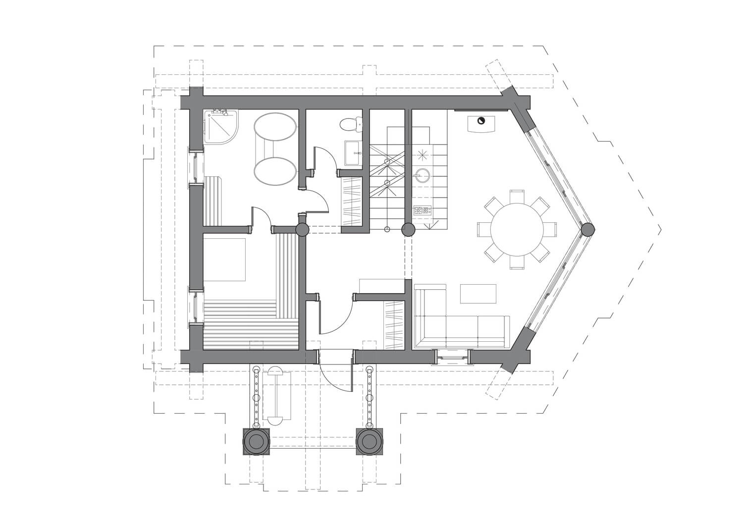 "Мериот" - большой по площади гостевой дом с двумя спальнями и баня. Строение лаконичное, но приметное — с легкой ассиметрией и панорамными окнами.