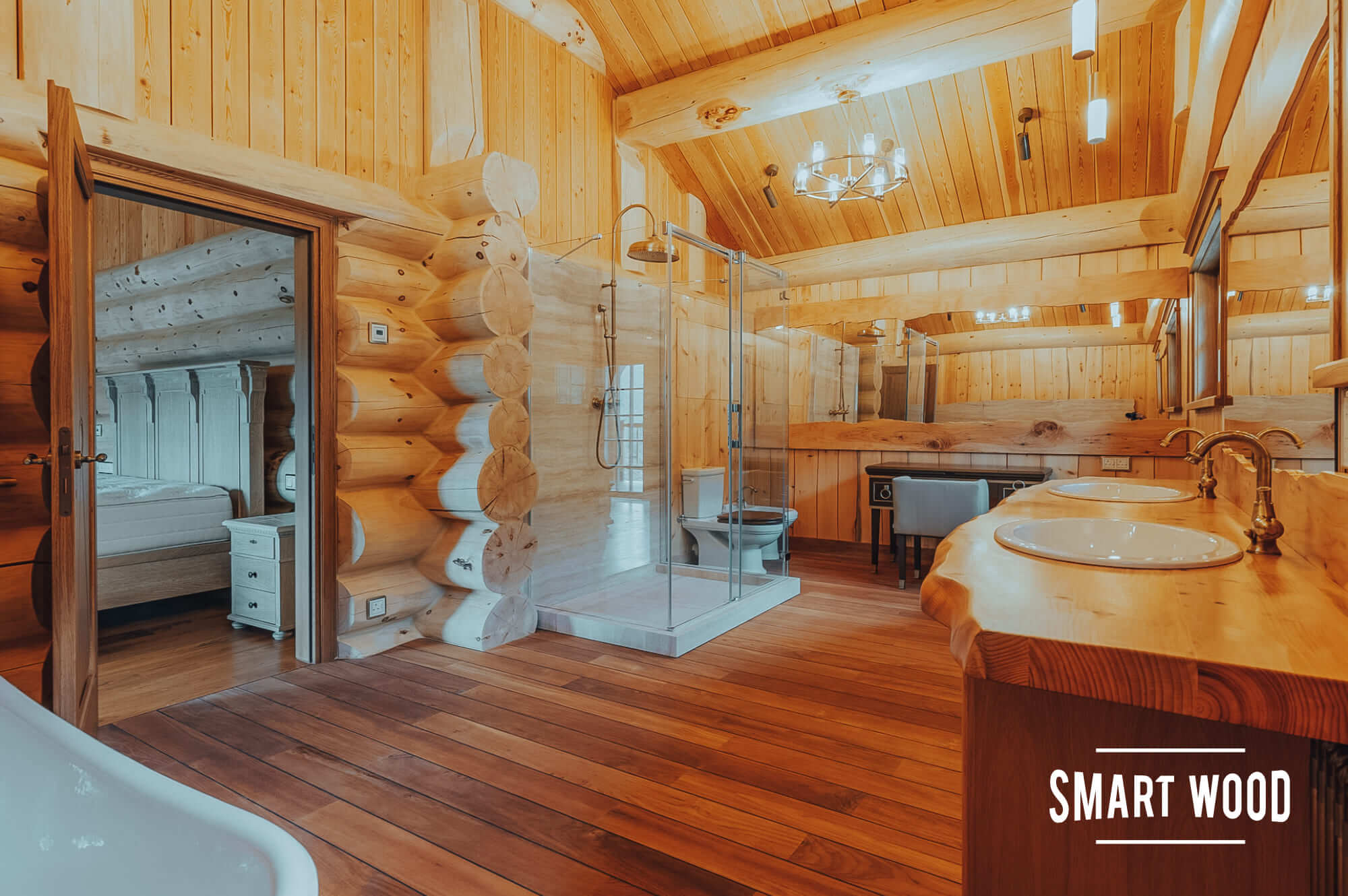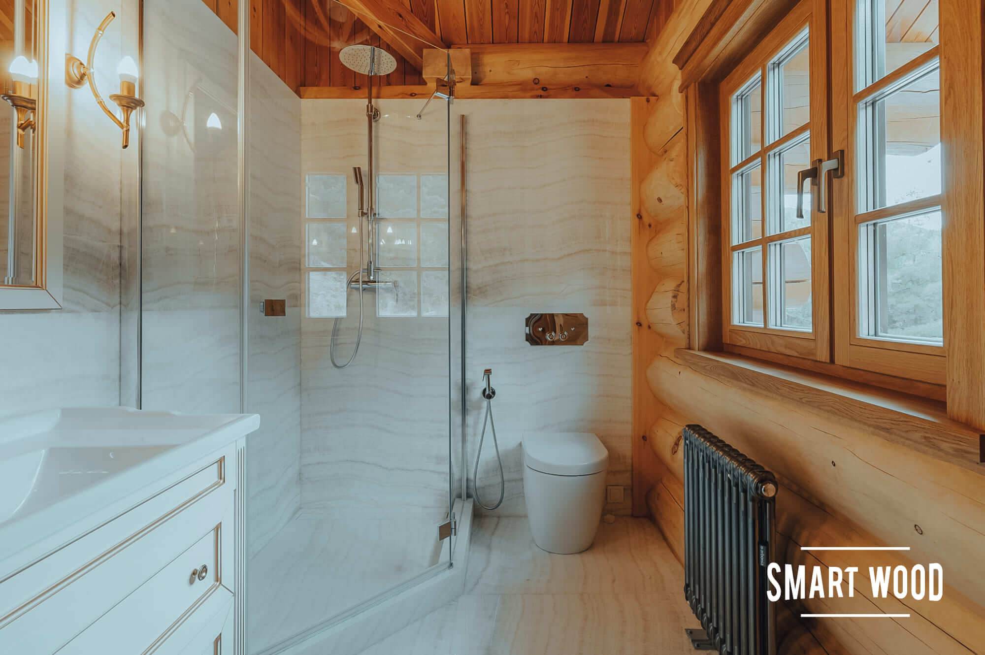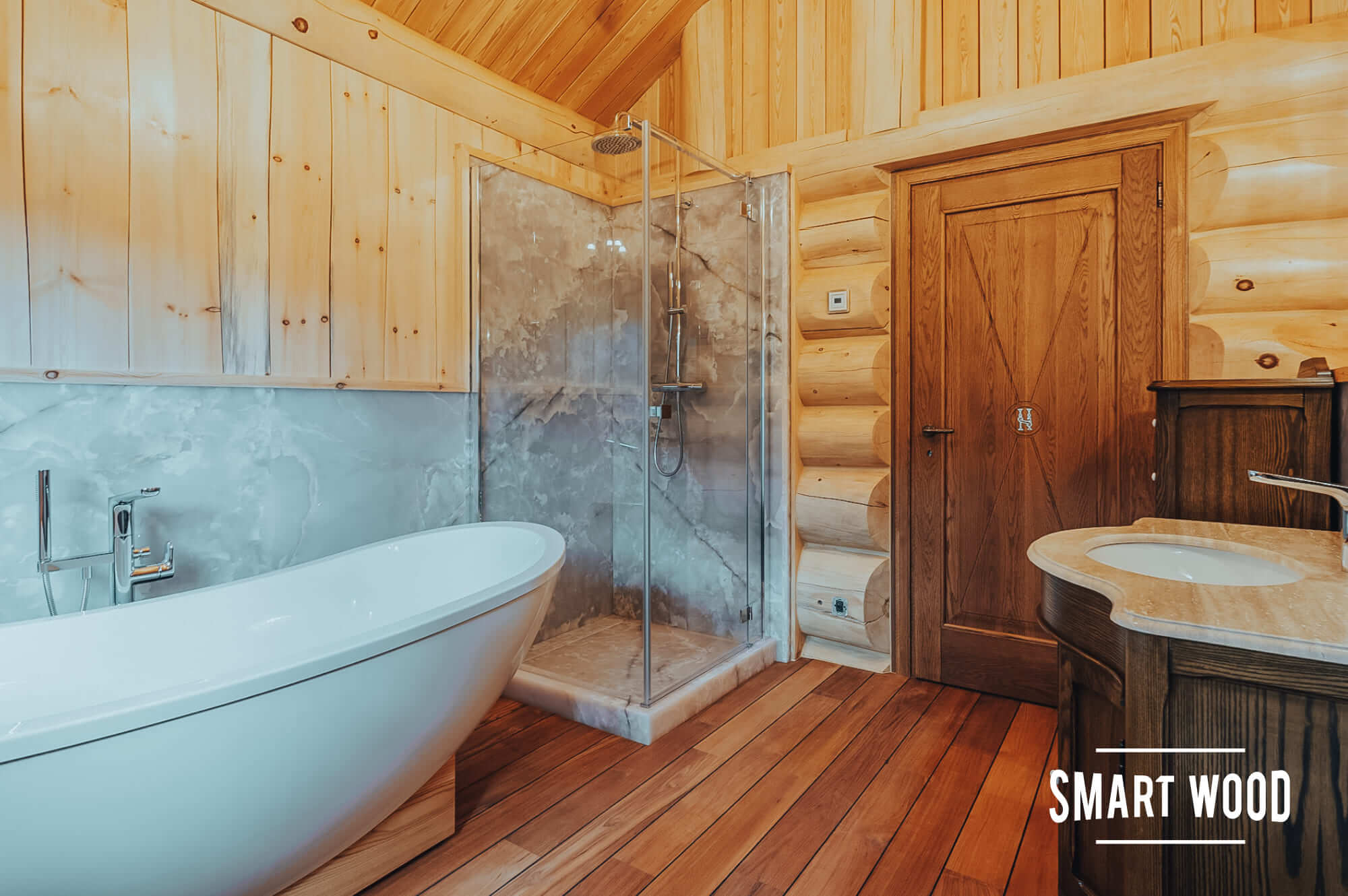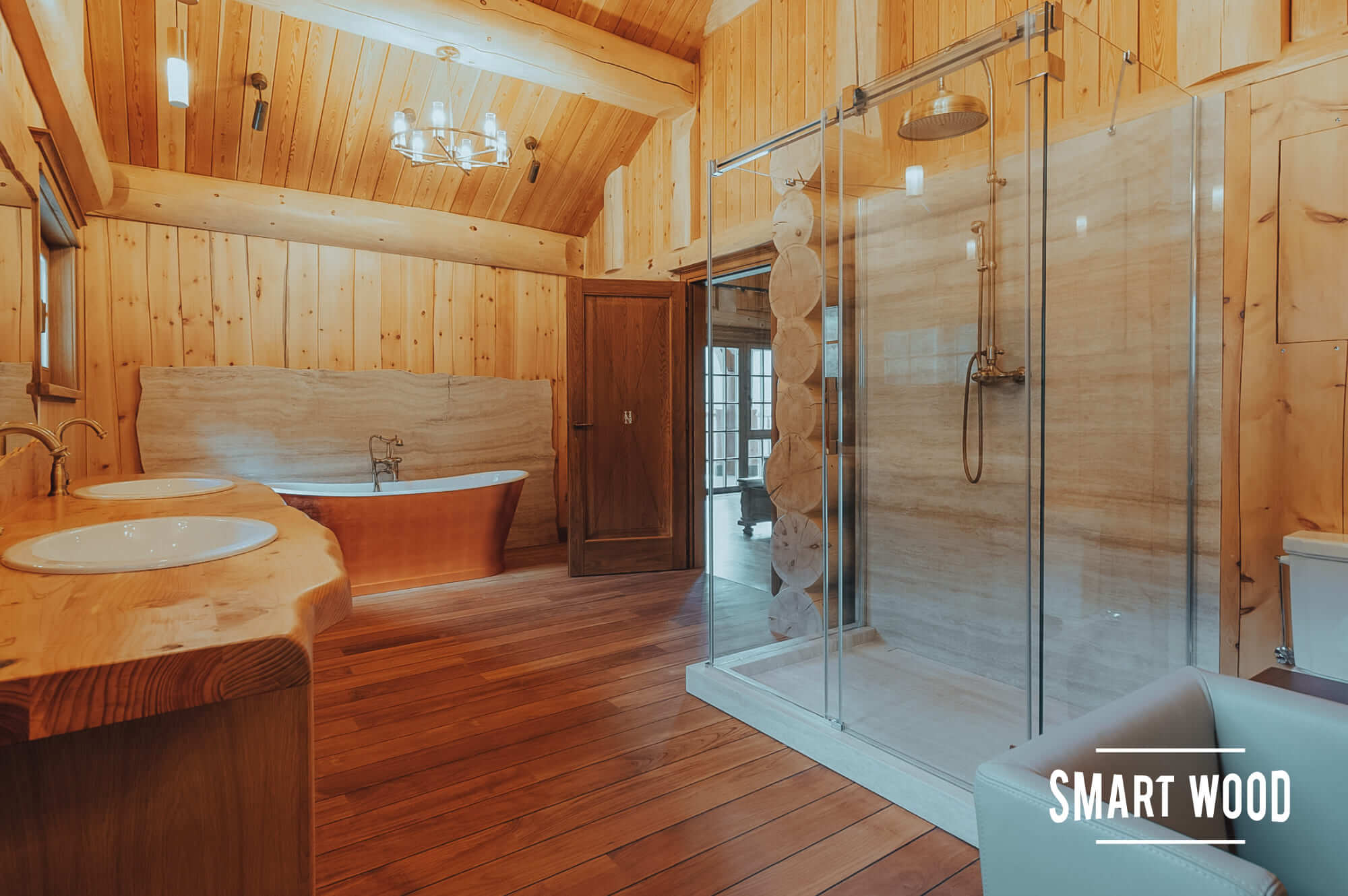 На фото — довольно классические решения в исполнении Smart Wood. Мы предпочитаем оставлять максимальное количество дерева, чтобы ванная комната гармонично сочеталась с интерьером дома. В зонах, где необходимо использовать плитку или стекло, например, душевых кабинах, мы формируем специальный каркас. Задача этого каркаса — отделить бревно или каркас сруба, которые дают небольшую усадку в процессе эксплуатации, от безусадочных материалов, чтобы сделать мокрую зону максимально стабильной.