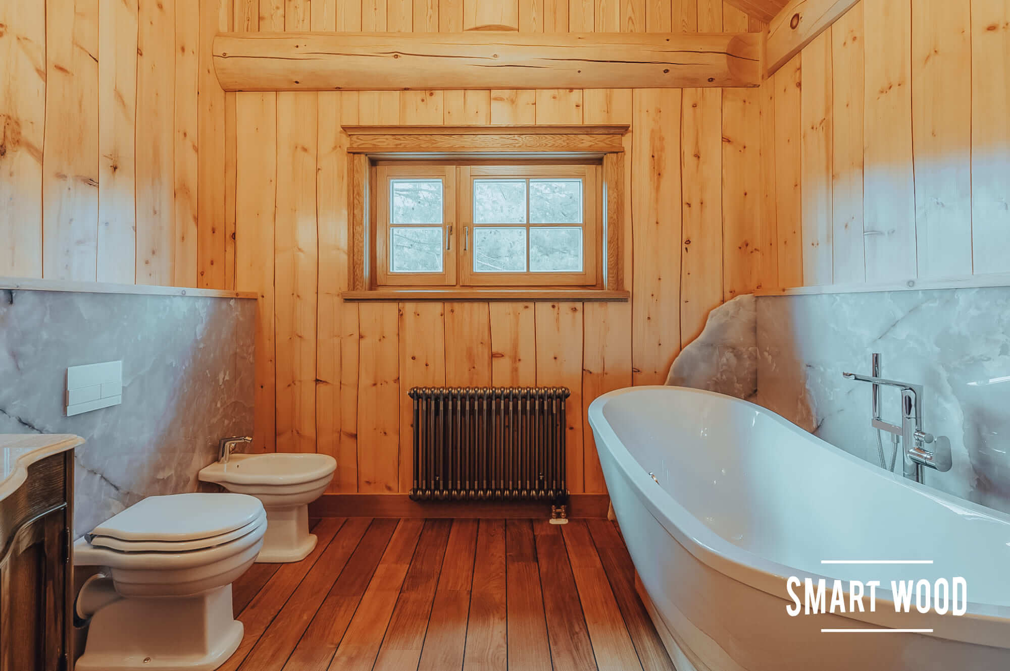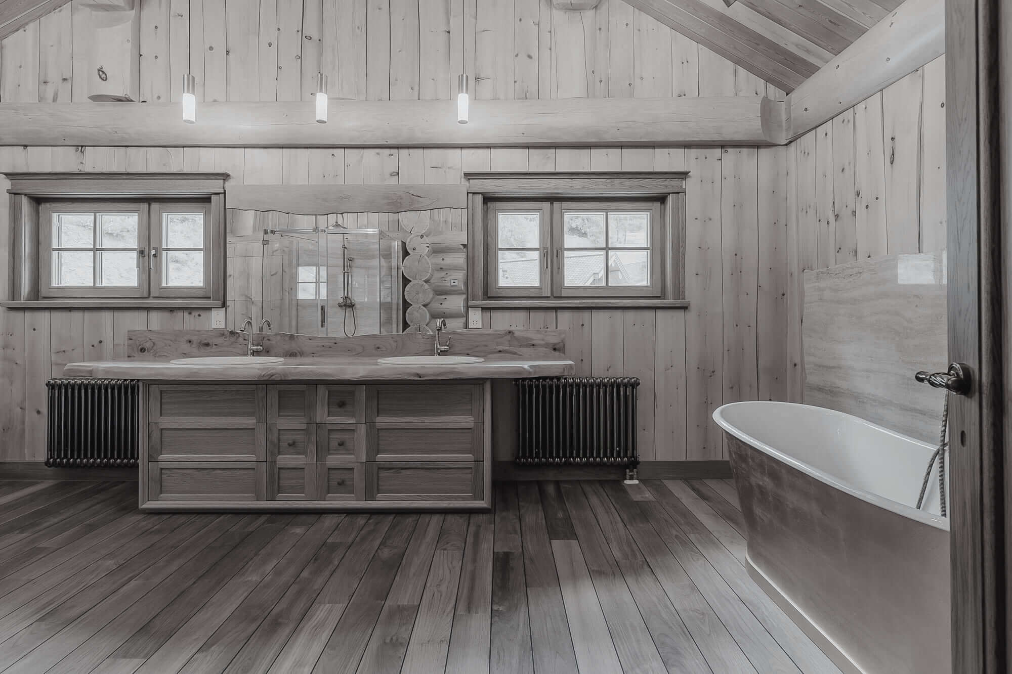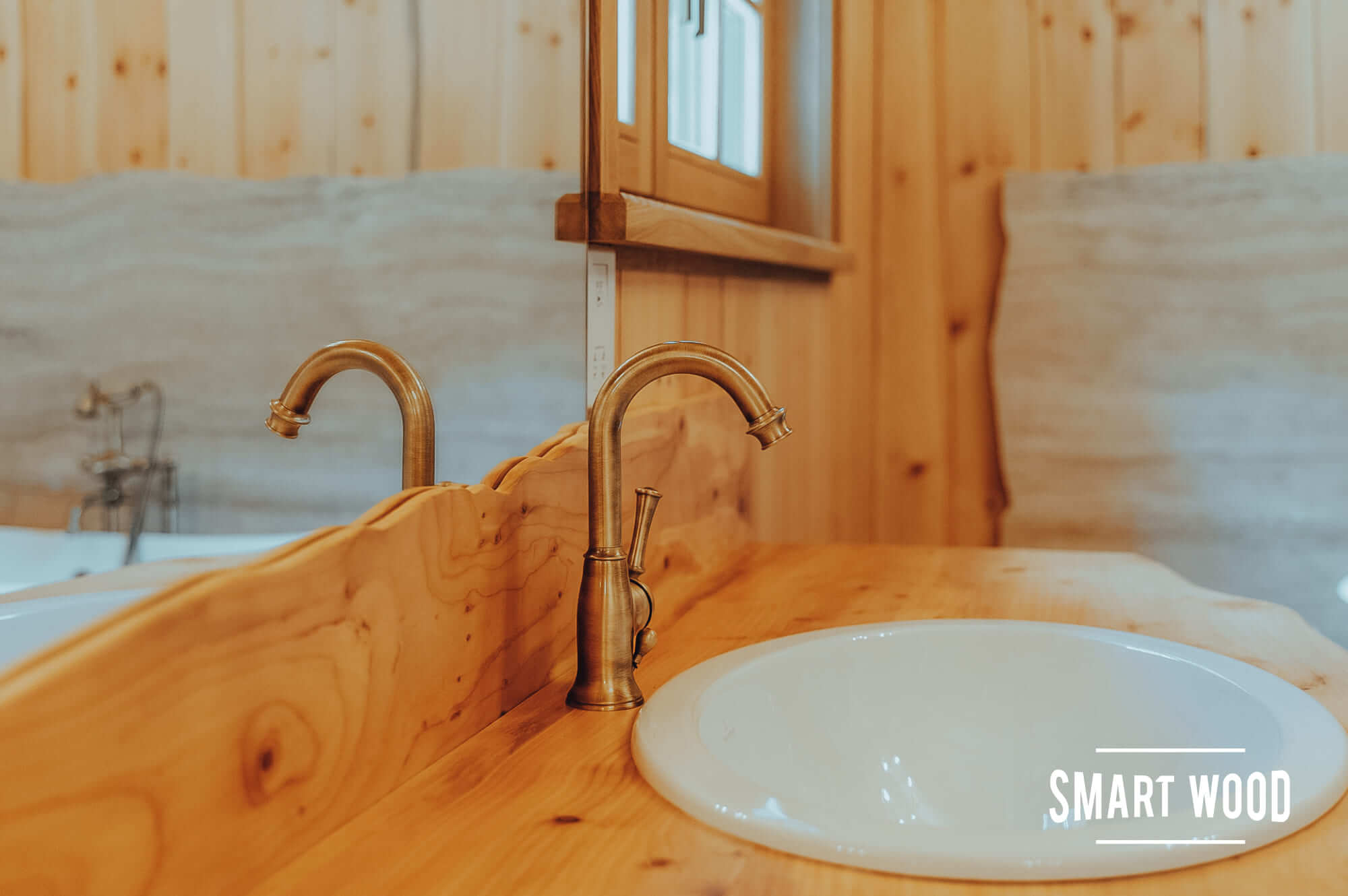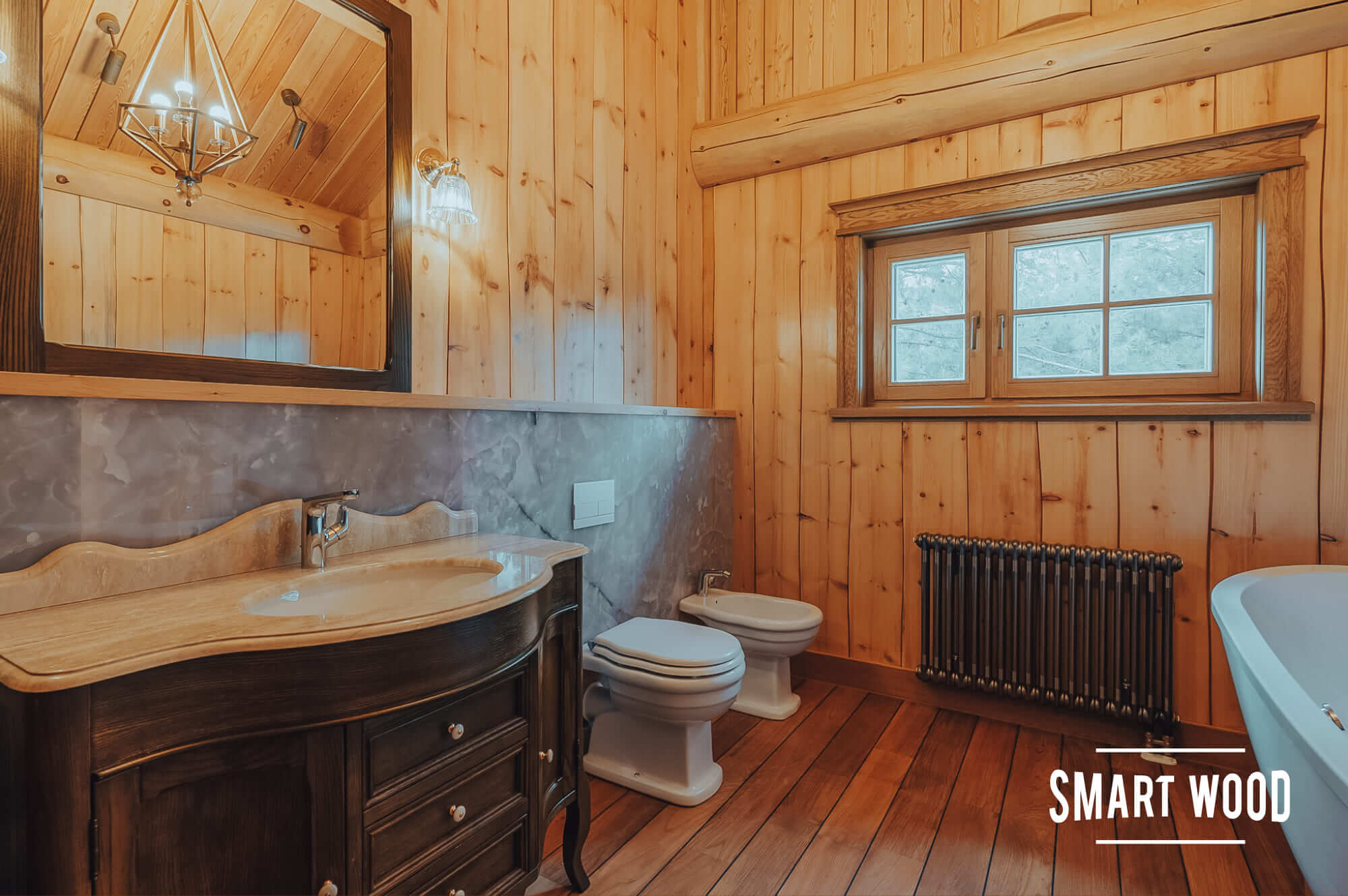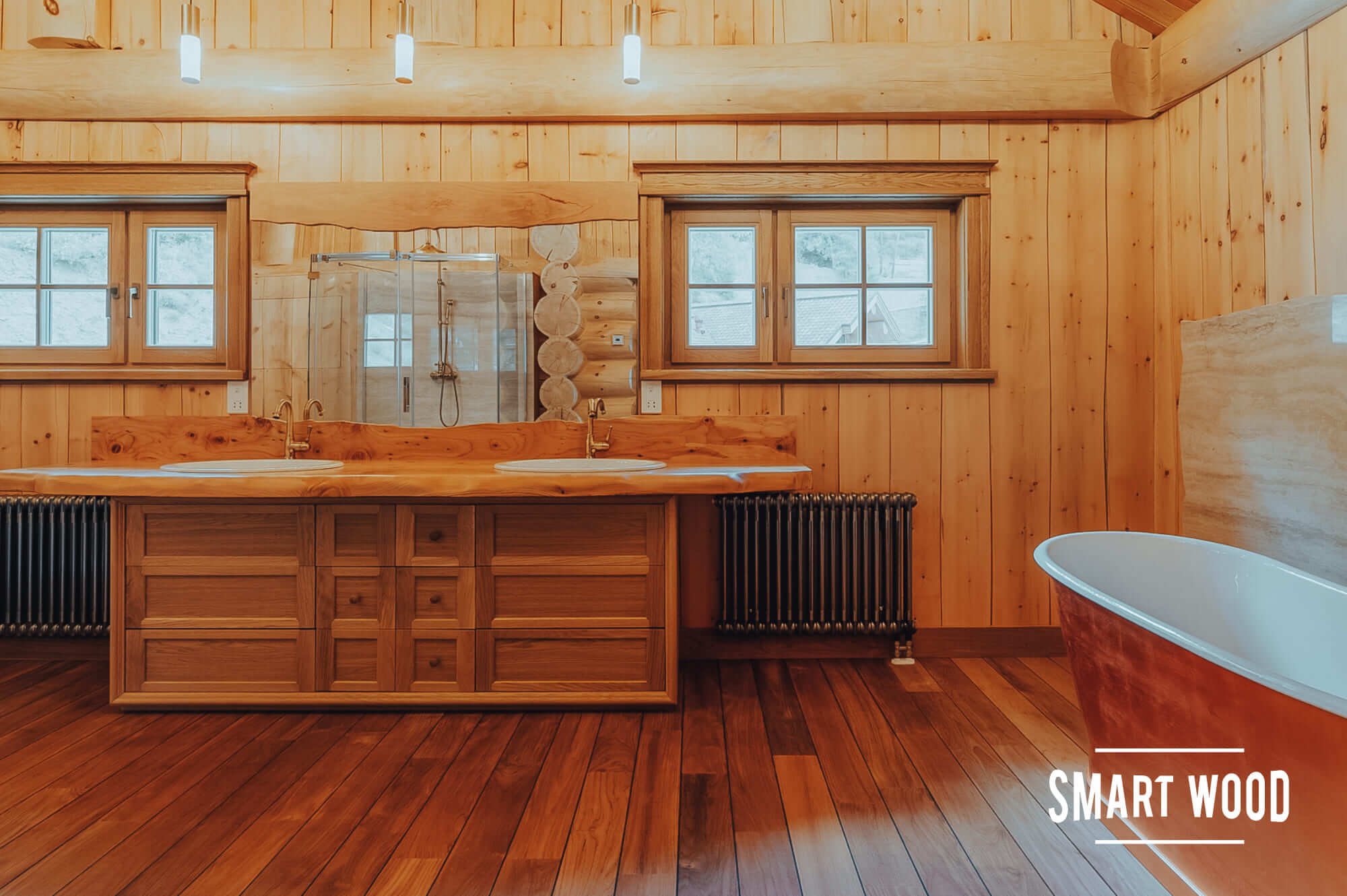 На фото — довольно классические решения в исполнении Smart Wood. Мы предпочитаем оставлять максимальное количество дерева, чтобы ванная комната гармонично сочеталась с интерьером дома. В зонах, где необходимо использовать плитку или стекло, например, душевых кабинах, мы формируем специальный каркас. Задача этого каркаса — отделить бревно или каркас сруба, которые дают небольшую усадку в процессе эксплуатации, от безусадочных материалов, чтобы сделать мокрую зону максимально стабильной.