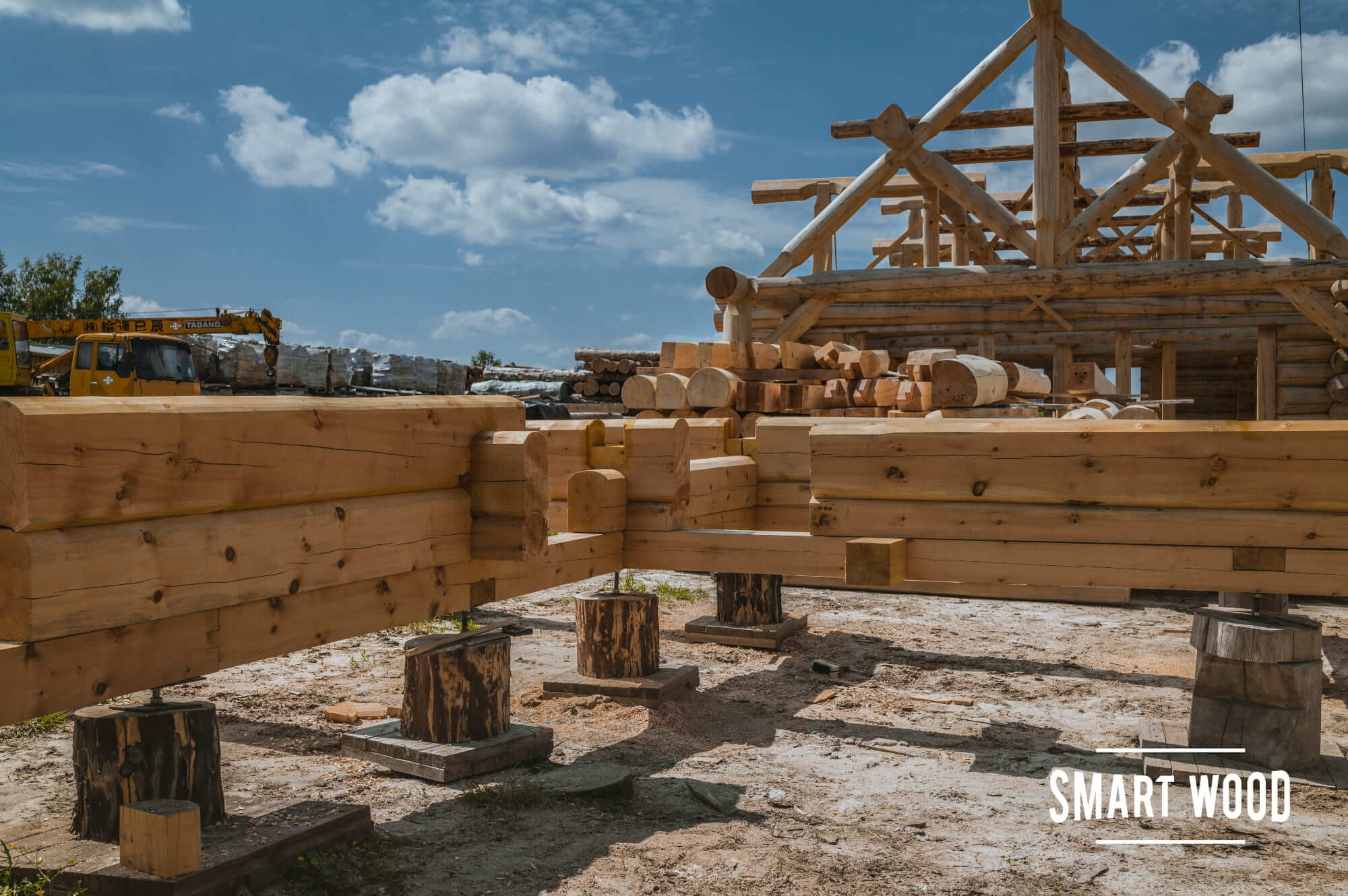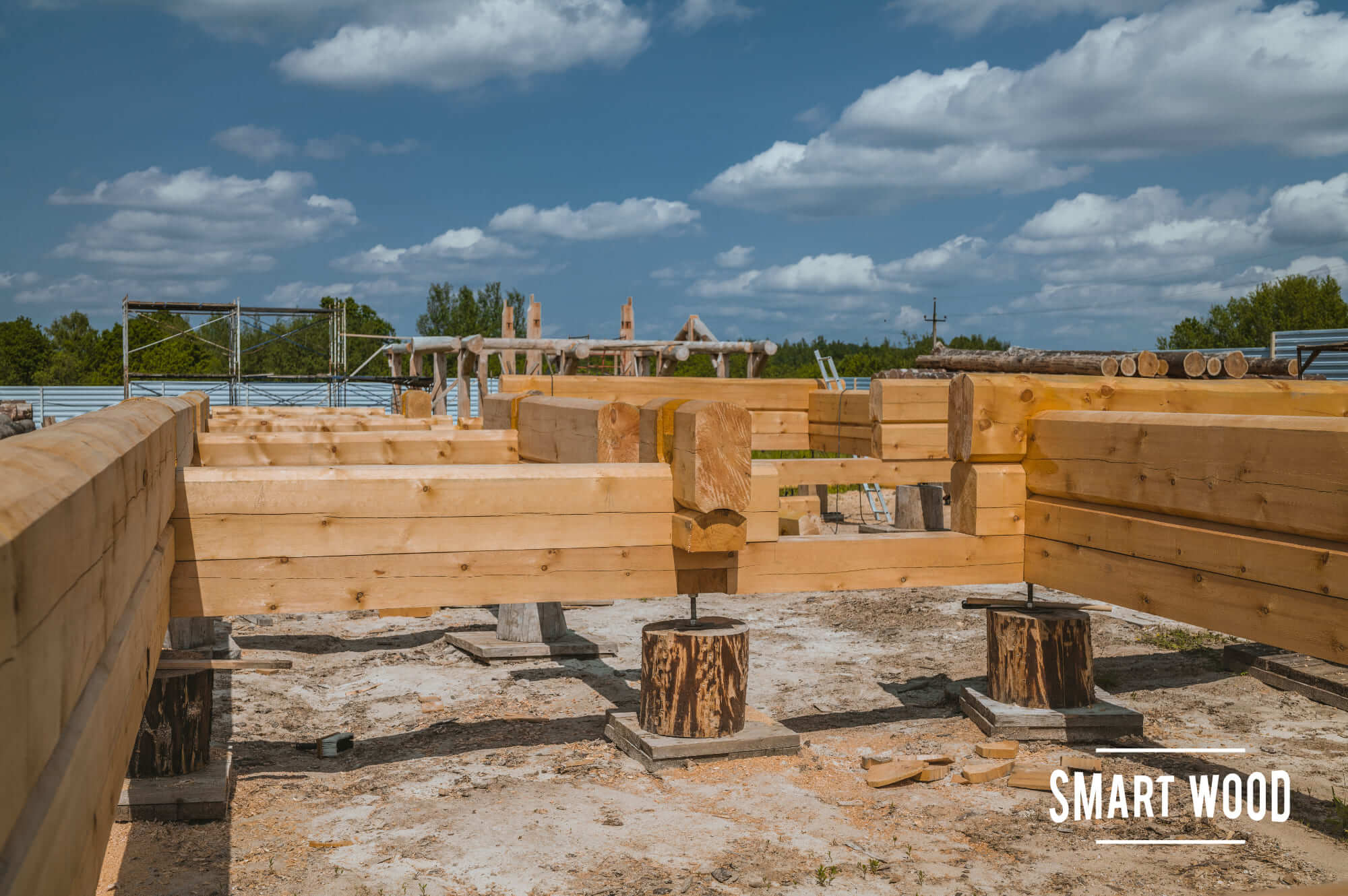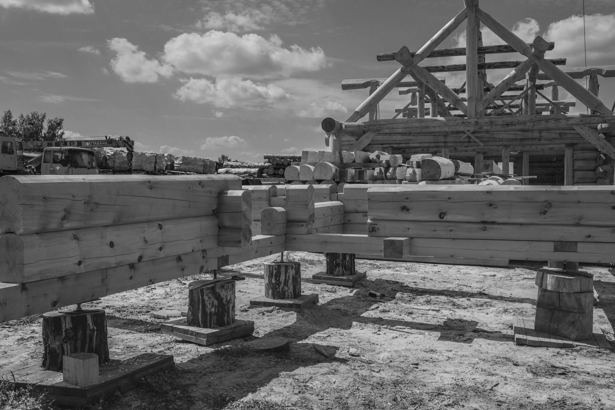 Поэтому, снова столкнувшись с проектом сруба из лафета, мы решили повторить такой опыт, предварительно позаботившись о том, чтобы взять для строительства самый подсушенный лафет из всего леса, имеющегося на складе. Это нужно для того, чтобы при усадке дома в процессе эксплуатации в чаше не открывались щели, или процесс этот был совсем незначительным. Такая задача стоит довольно часто, поэтому наш склад леса формируется на год-полтора строительства. И если при поступлении леса на склад его поверхностная влажность составляет около 70-80%, то при использовании, к примеру, на текущем проекте тот же показатель будет уже 25%. Это значит, что практически вся влага из древесины вышла, и усадка будет минимальной.