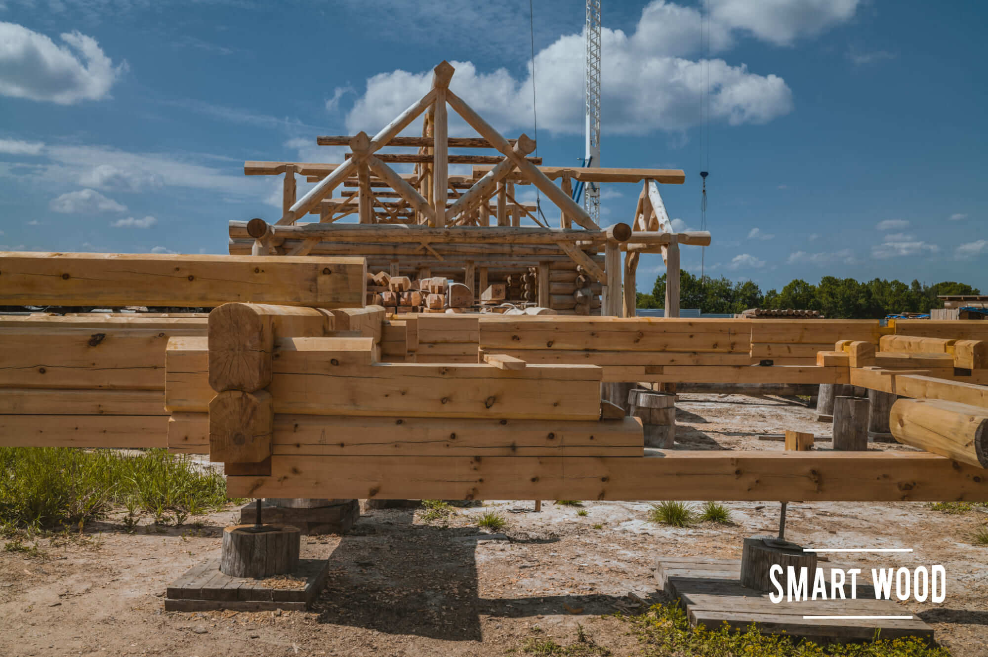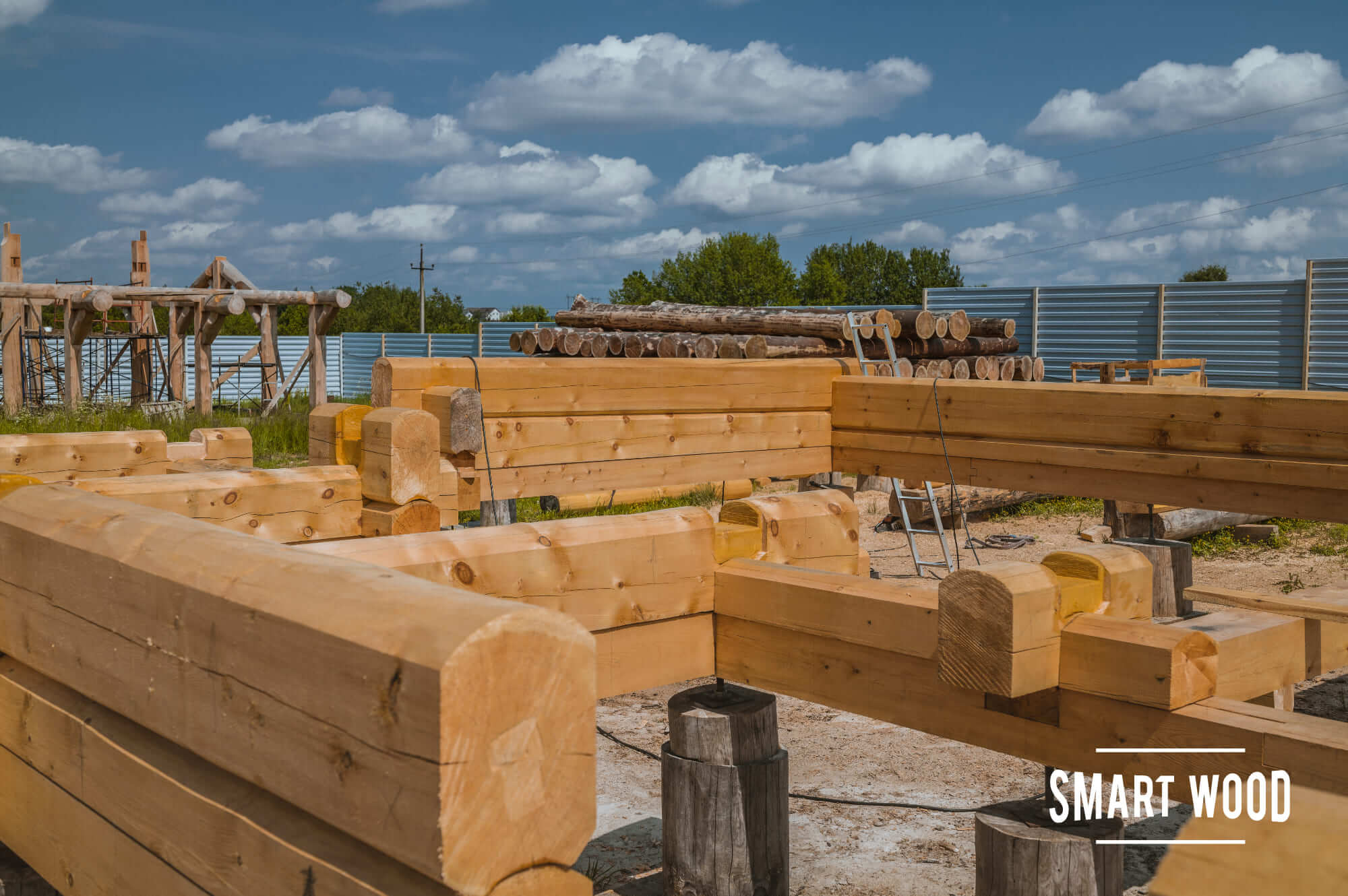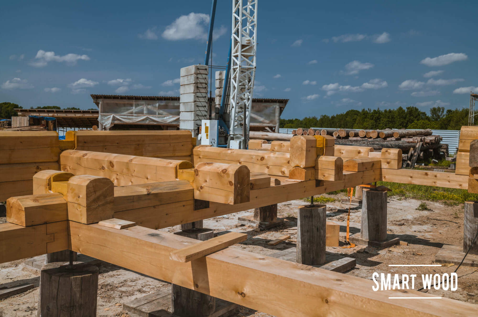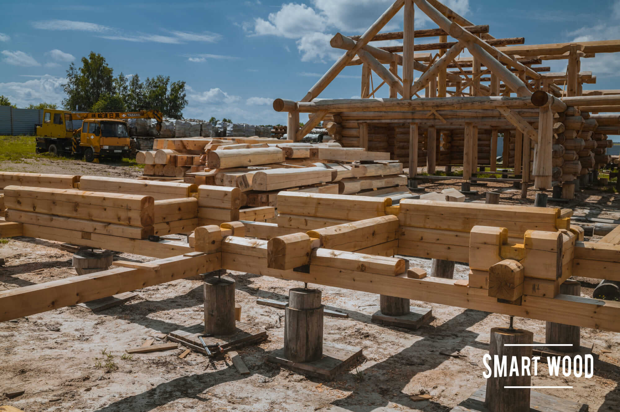 Поэтому, снова столкнувшись с проектом сруба из лафета, мы решили повторить такой опыт, предварительно позаботившись о том, чтобы взять для строительства самый подсушенный лафет из всего леса, имеющегося на складе. Это нужно для того, чтобы при усадке дома в процессе эксплуатации в чаше не открывались щели, или процесс этот был совсем незначительным. Такая задача стоит довольно часто, поэтому наш склад леса формируется на год-полтора строительства. И если при поступлении леса на склад его поверхностная влажность составляет около 70-80%, то при использовании, к примеру, на текущем проекте тот же показатель будет уже 25%. Это значит, что практически вся влага из древесины вышла, и усадка будет минимальной.